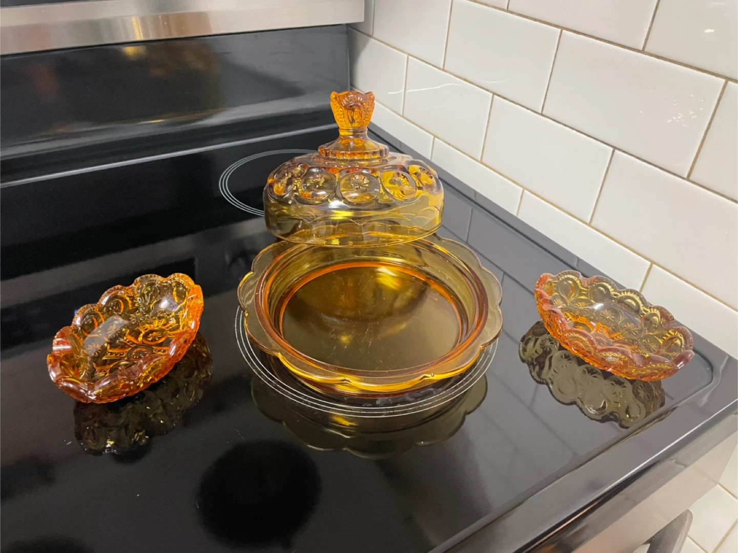 Amber Glass Moon & Stars Pattern Butter Dish with 2 Small Bowls