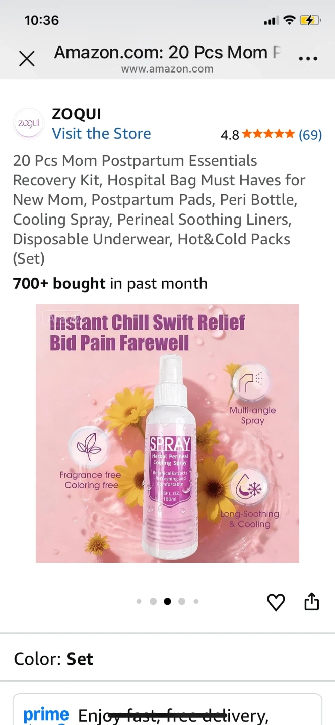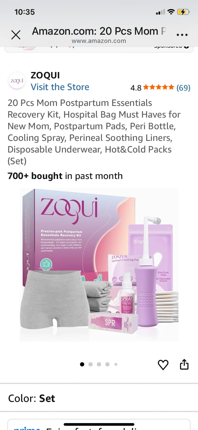 This ZOQUI postpartum essentials recovery kit includes 20 pieces for new moms. It contains postpartum pads, a peri bottle, cooling spray, perineal soothing liners, disposable underwear, and hot & cold packs. This kit is designed to help with postpartum recovery needs.