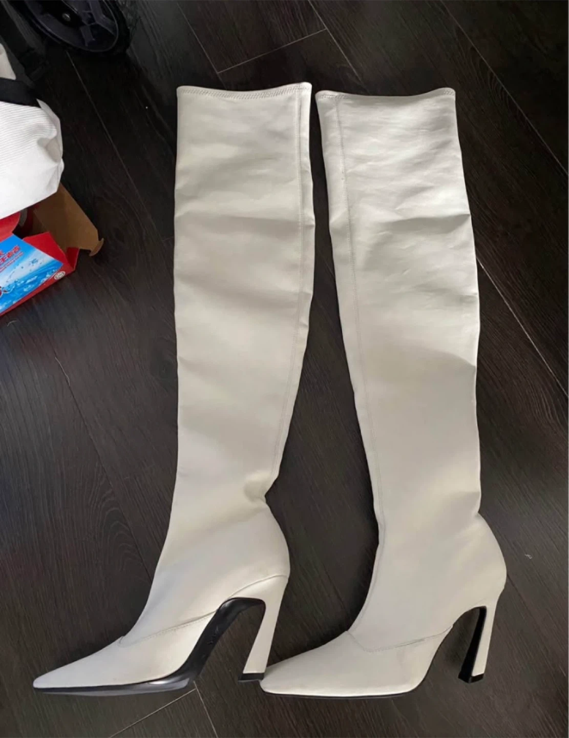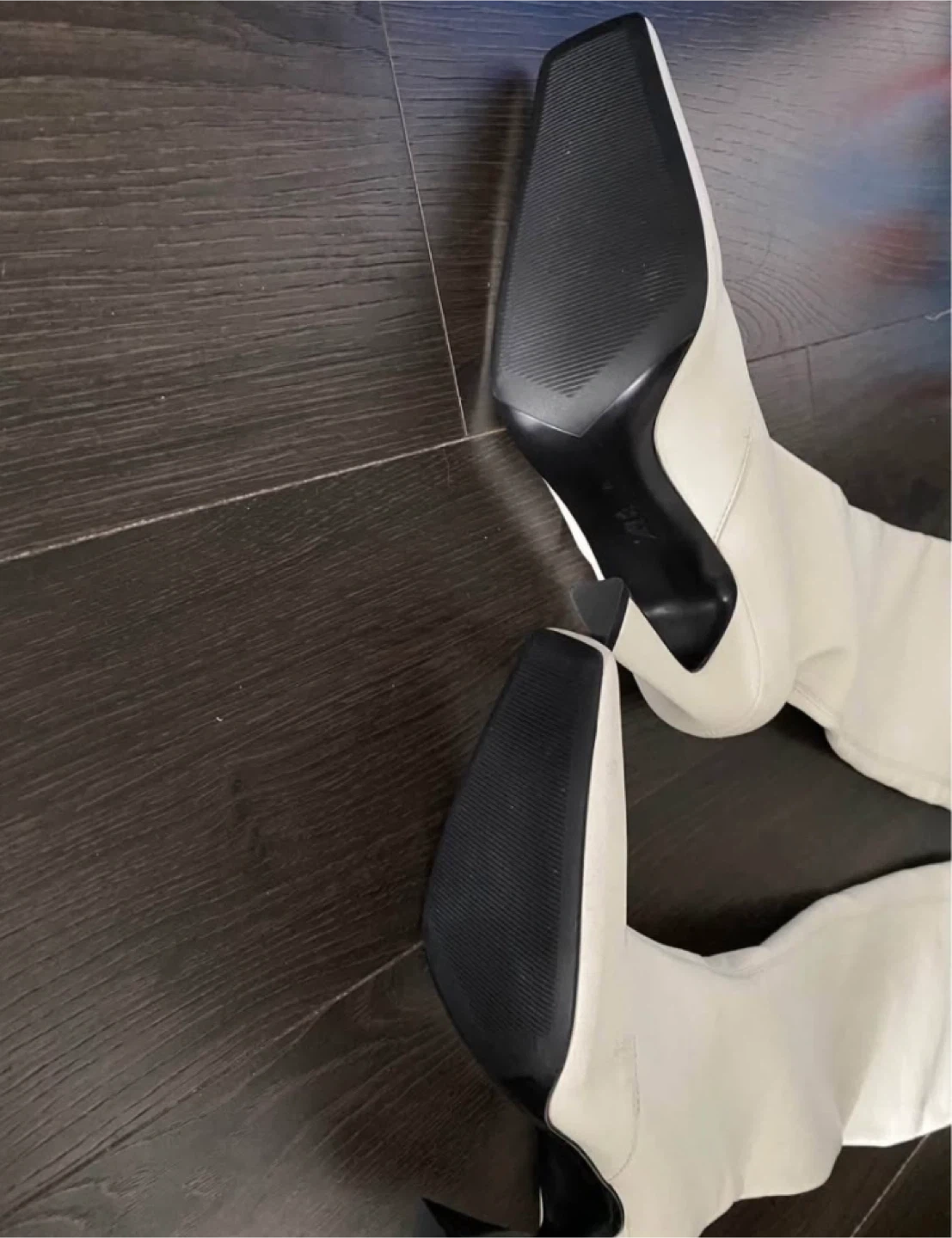 White knee-high boots with a stylish square toe. These boots have a comfortable heel height. Made from faux leather material. Perfect for dressing up or down!