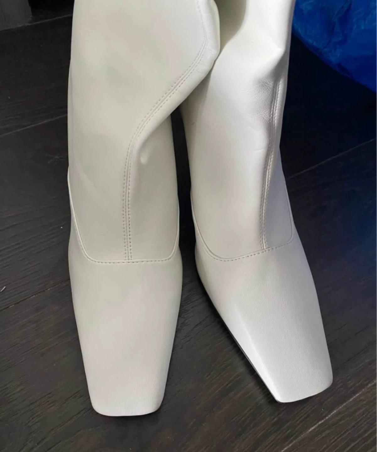 White knee-high boots with a stylish square toe. These boots have a comfortable heel height. Made from faux leather material. Perfect for dressing up or down!