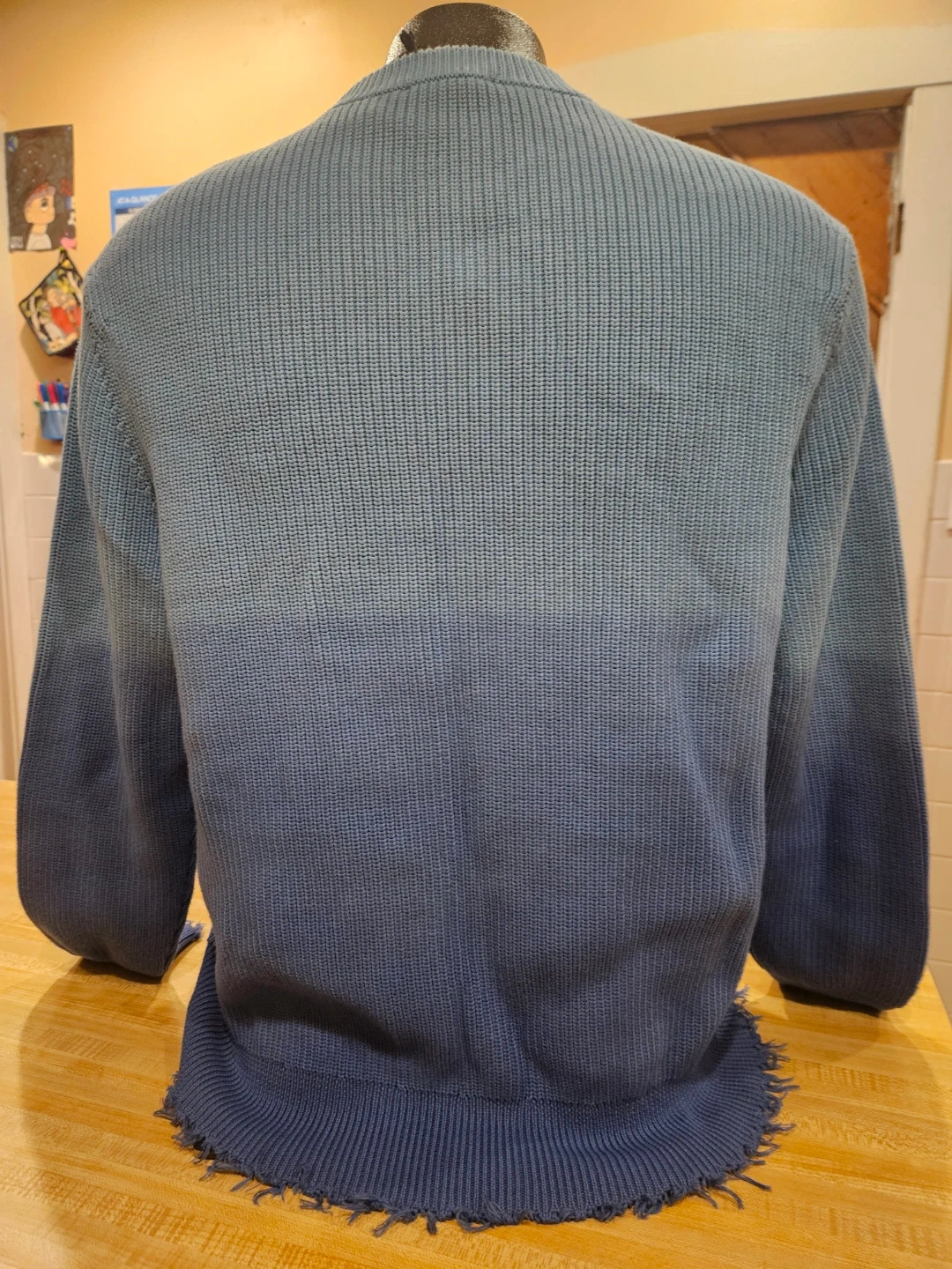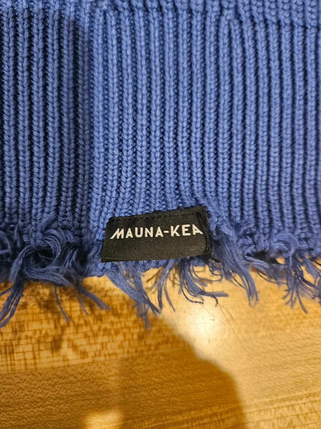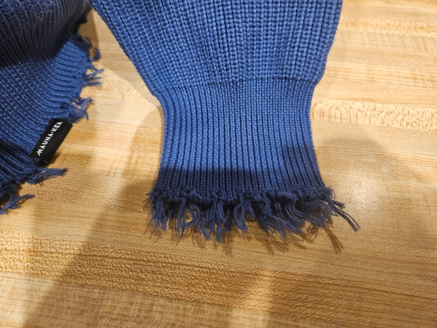 This MAUNA-KEA sweater features a ribbed knit construction with a frayed hem and cuffs. It has a cool ombre effect, fading from light blue to dark blue. The material feels like a soft knit, perfect for layering. Store price $115.00.