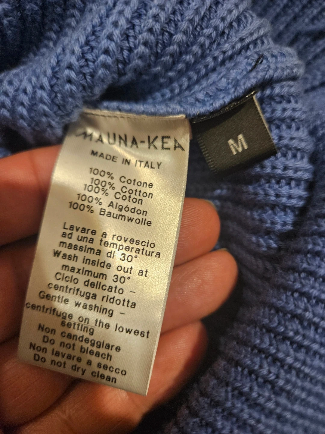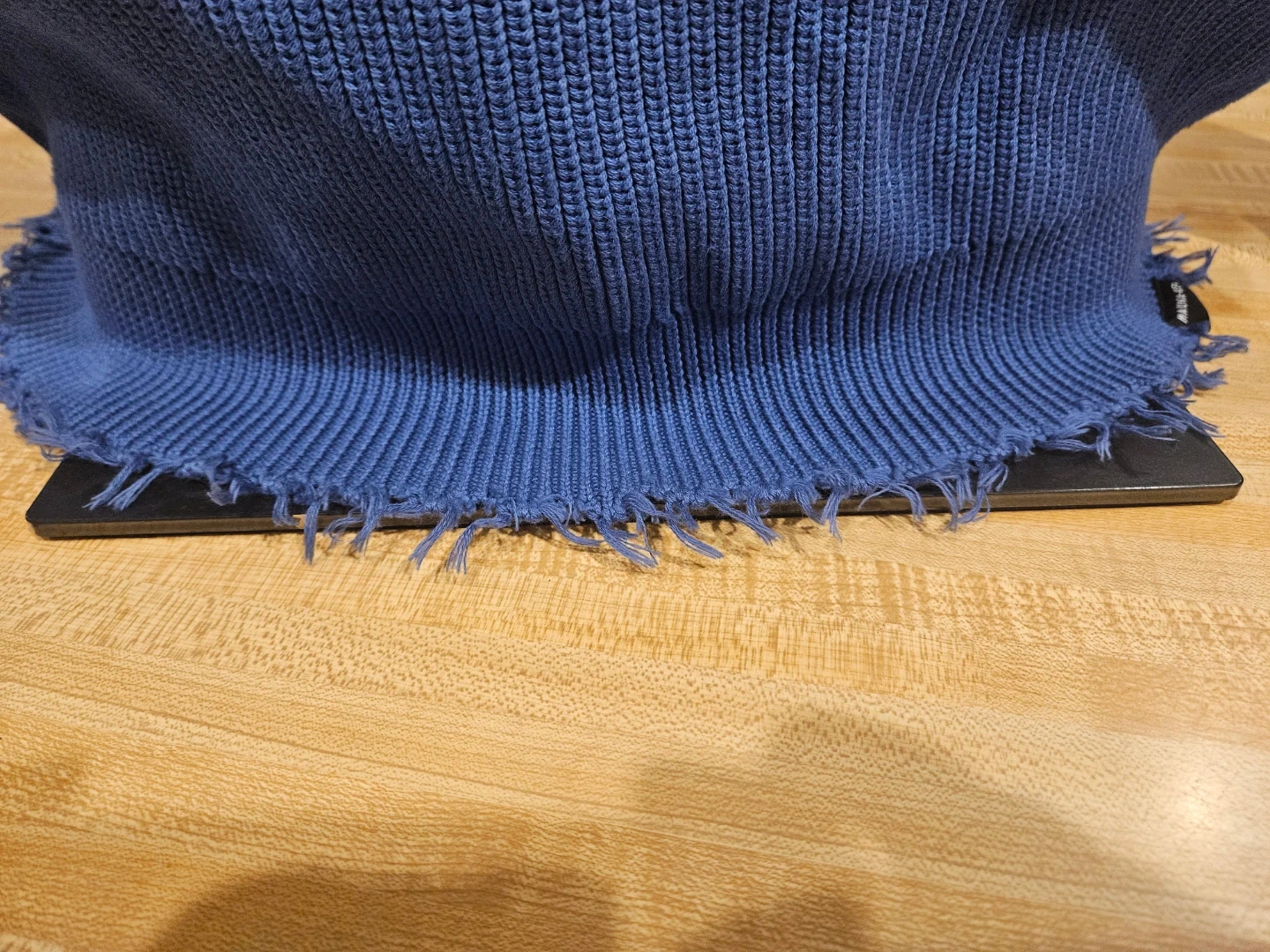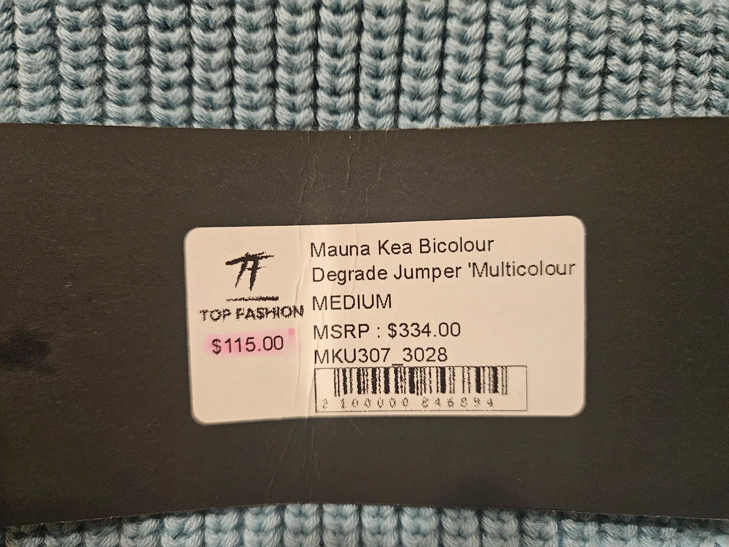 This MAUNA-KEA sweater features a ribbed knit construction with a frayed hem and cuffs. It has a cool ombre effect, fading from light blue to dark blue. The material feels like a soft knit, perfect for layering. Store price $115.00.
