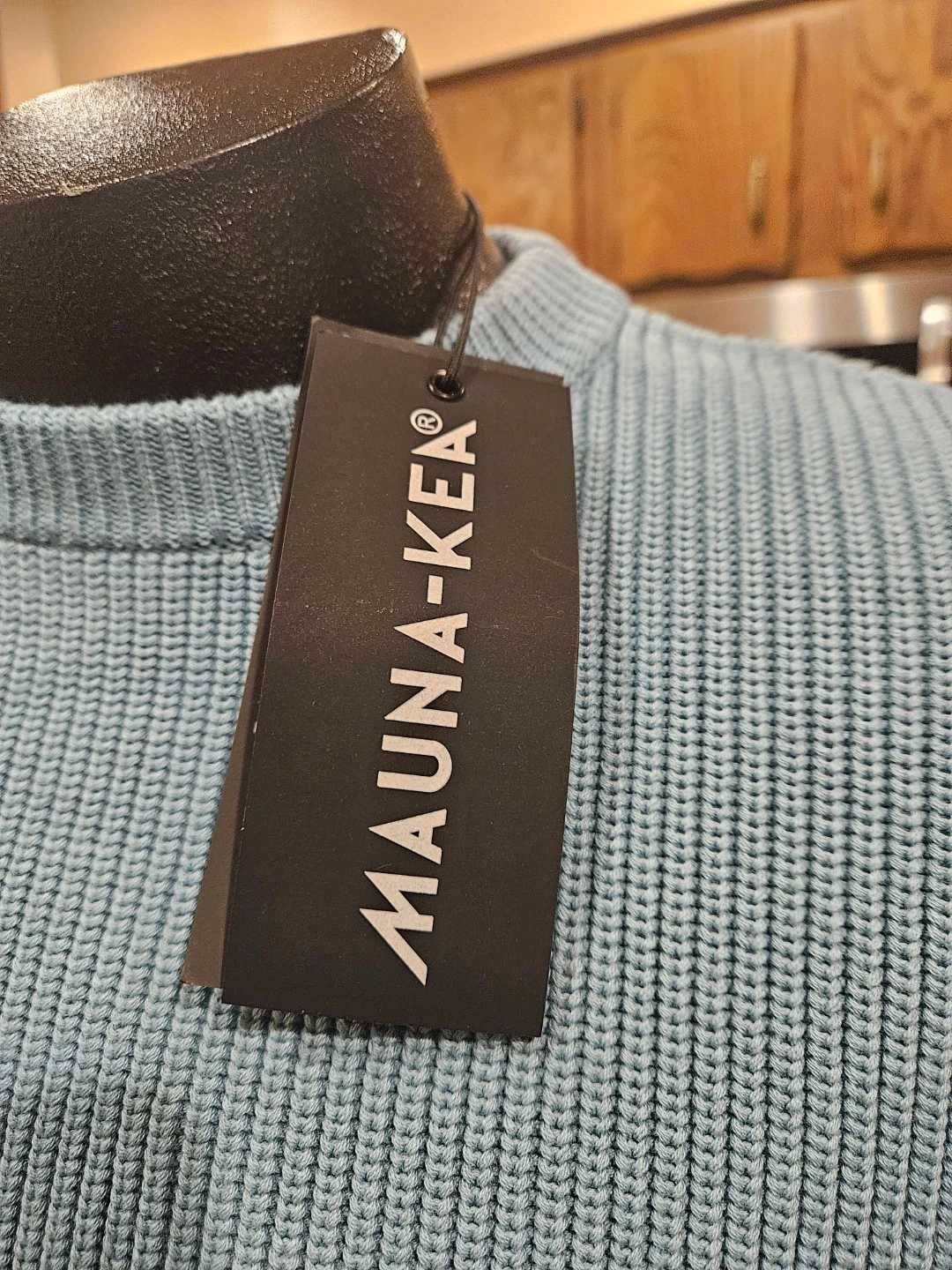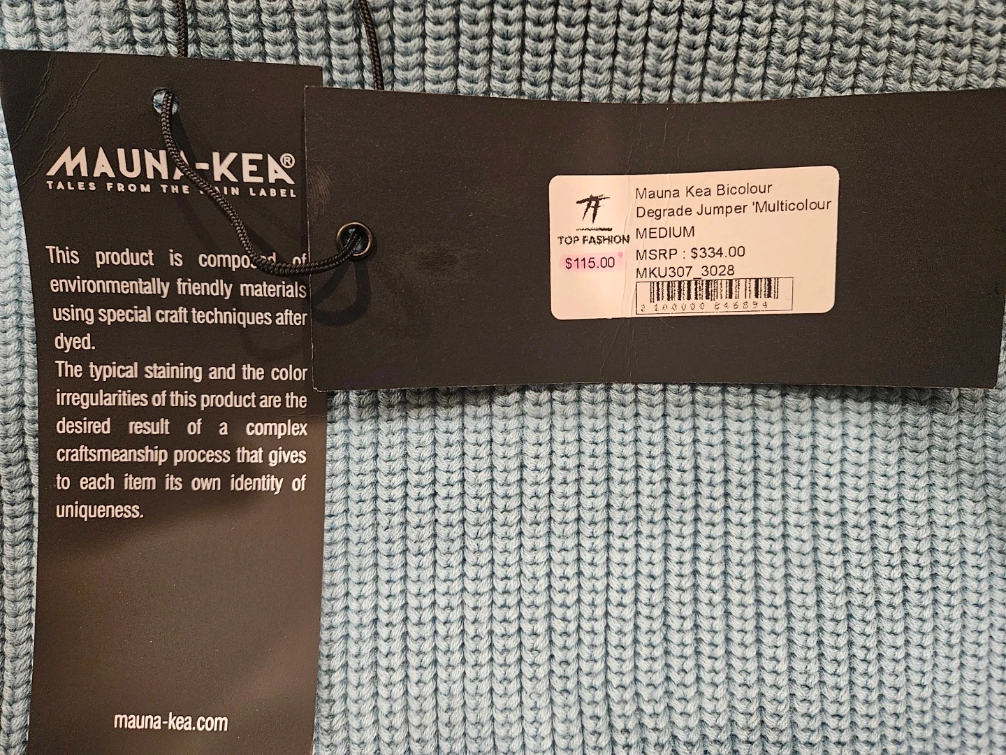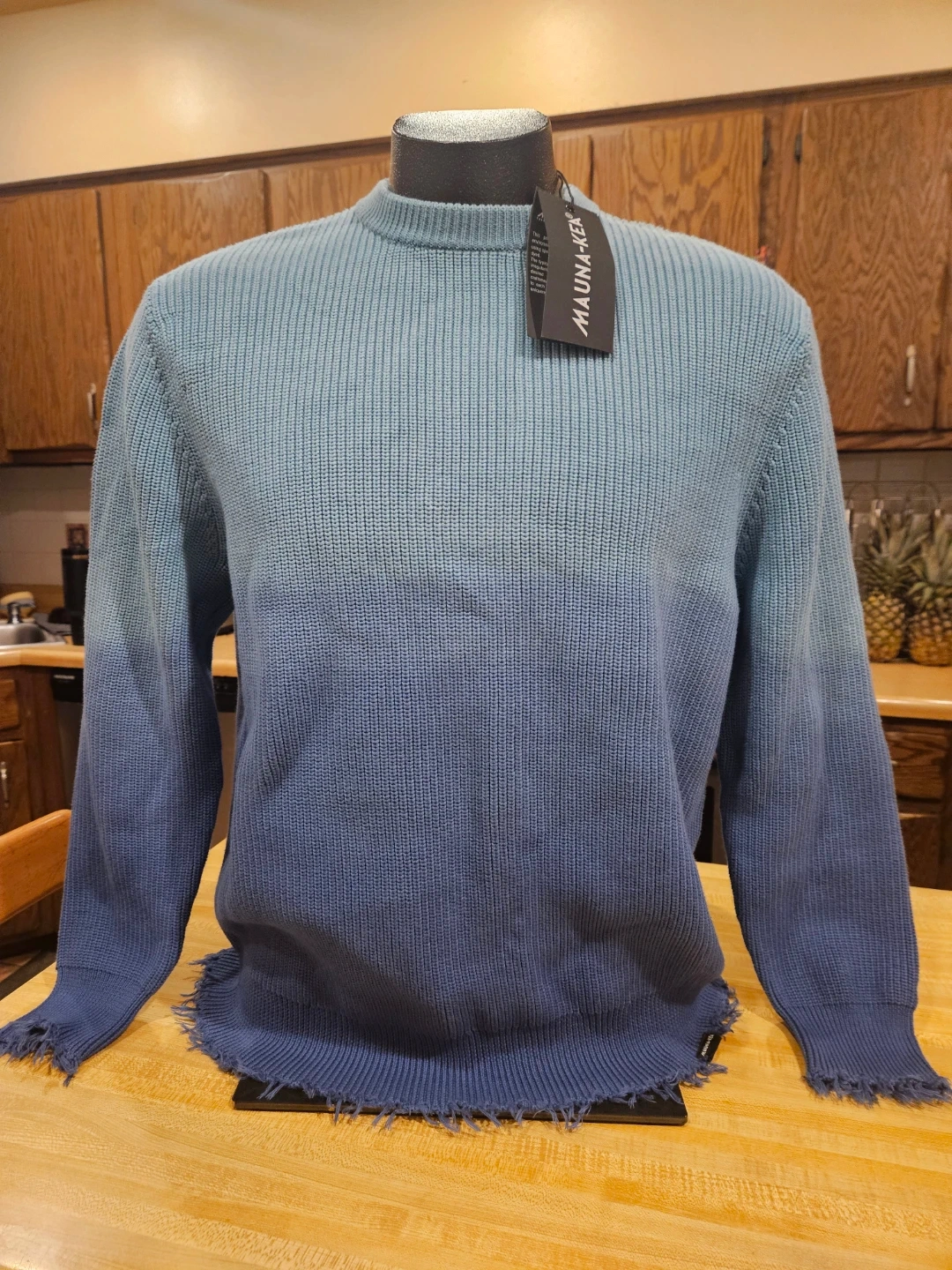 This MAUNA-KEA sweater features a ribbed knit construction with a frayed hem and cuffs. It has a cool ombre effect, fading from light blue to dark blue. The material feels like a soft knit, perfect for layering. Store price $115.00.