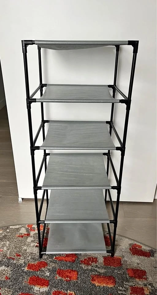 6-Tier shelf/shoe organizer with fabric shelves. Breaks down and sets up easily and quickly. Shelves can be removed to make unit shorter if needed. Can even be broken down into 2 shorter shelves.
