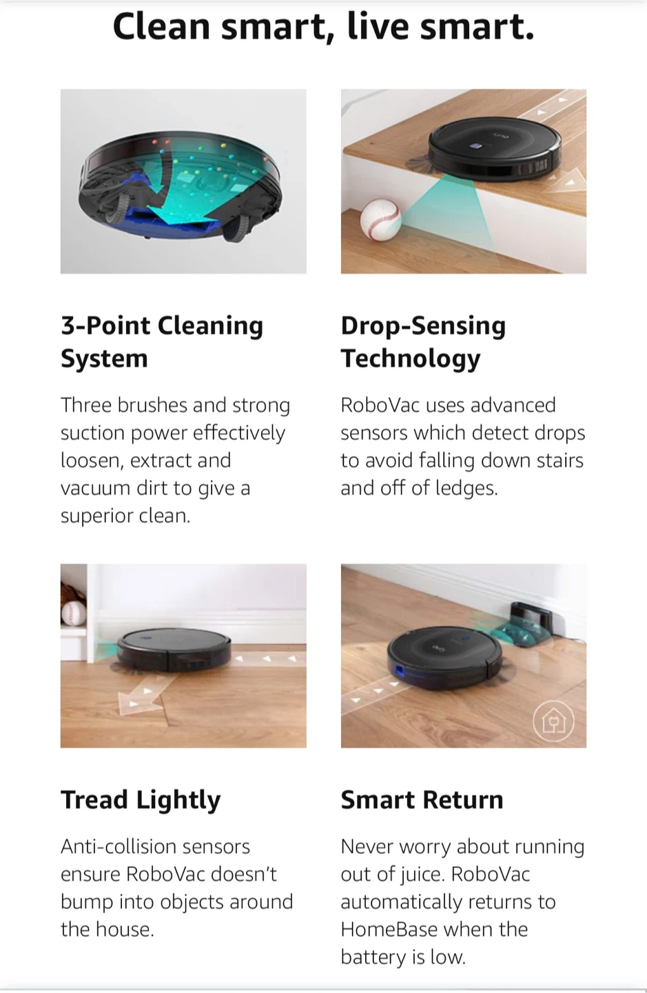 This little guy has powerful suction, smart drop-sensing so it won’t throw itself down the stairs, and anti-collision sensors to keep your furniture safe. When it’s done , it automatically cruises back to its charging base.