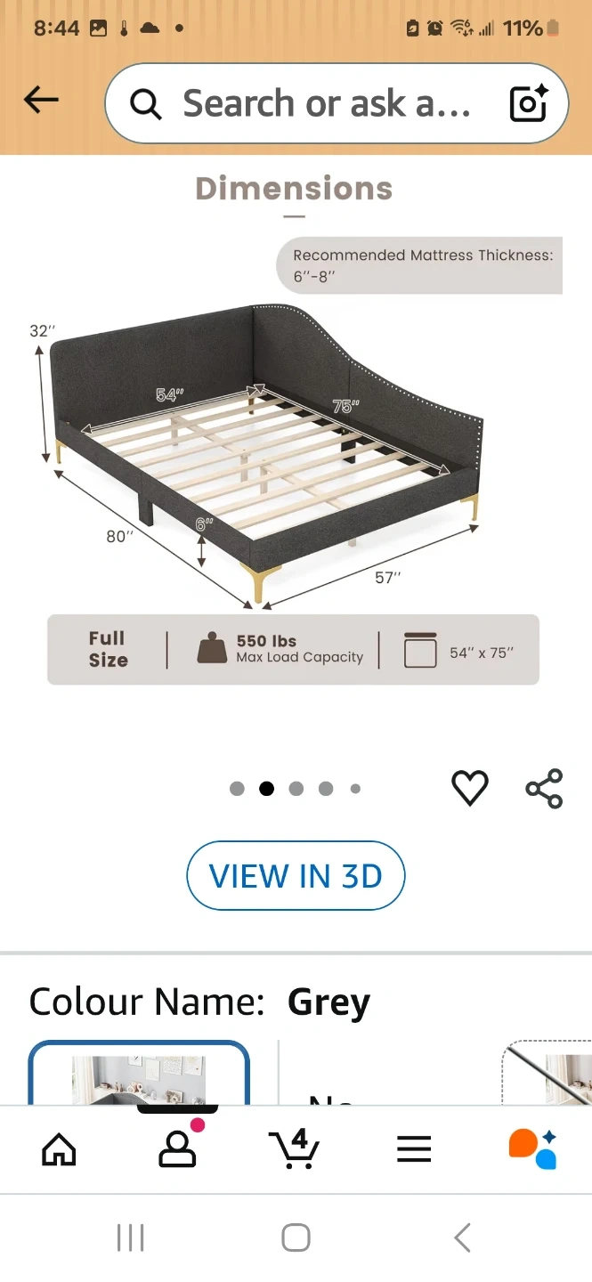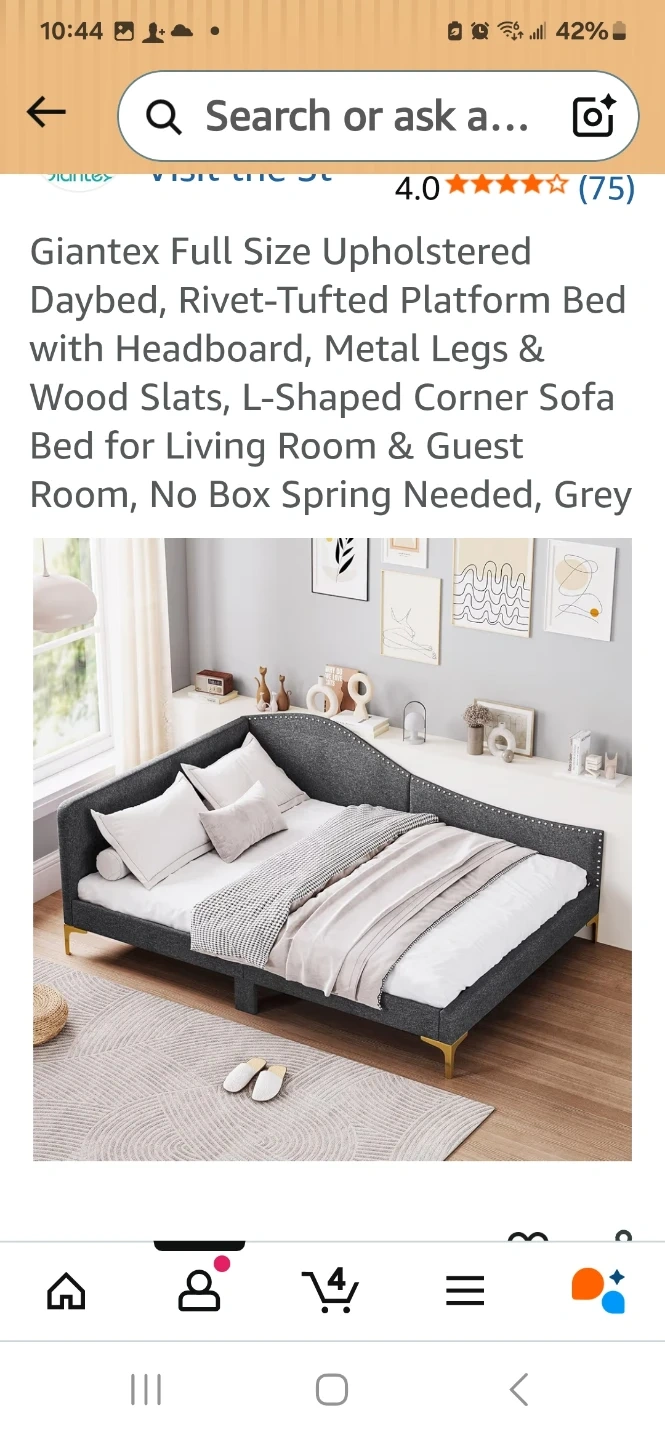 Giantex upholstered daybed with rivet-tufted platform and metal legs. It's a full-size bed with wood slats and includes a headboard. Recommended mattress thickness is 6"-8".