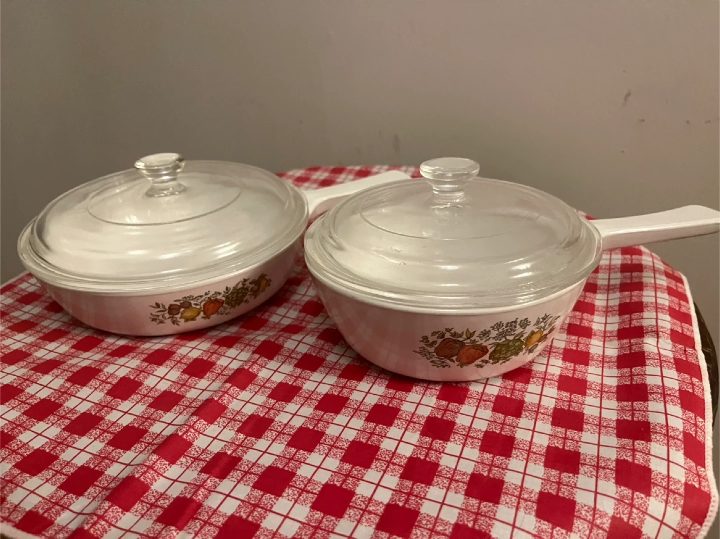 Two white CorningWare casserole dishes with a fruity design. Each dish has a white handle and comes with a clear glass lid. They're made from durable vitroceramic material.