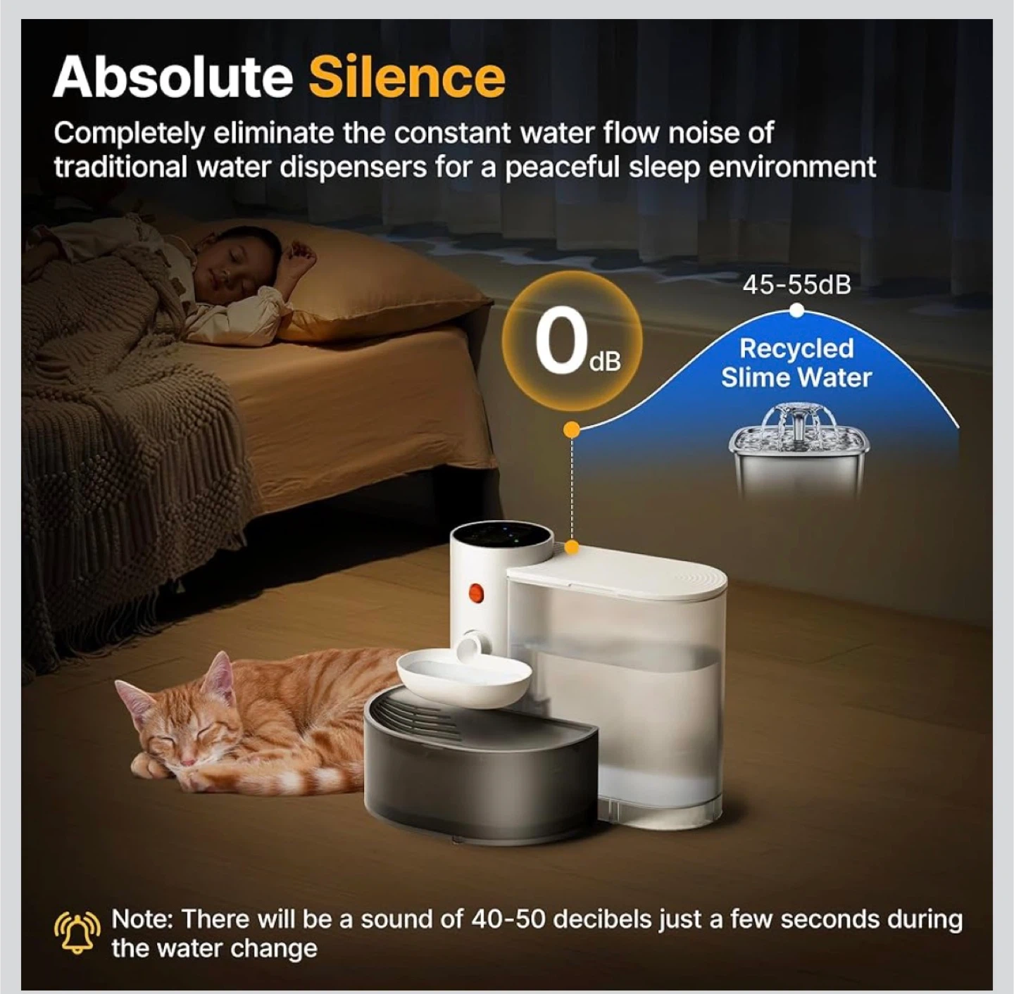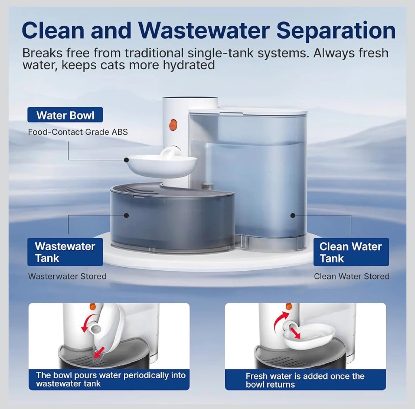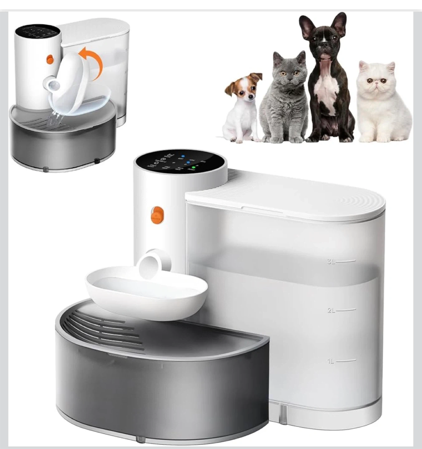 This automatic pet water fountain has a 3.5L capacity, perfect for keeping your pets hydrated. It features a self-refill system with no filters needed and a separate wastewater tank. The unit is USB-C rechargeable with up to 180 days of battery life. Made with Food-Contact Grade ABS.