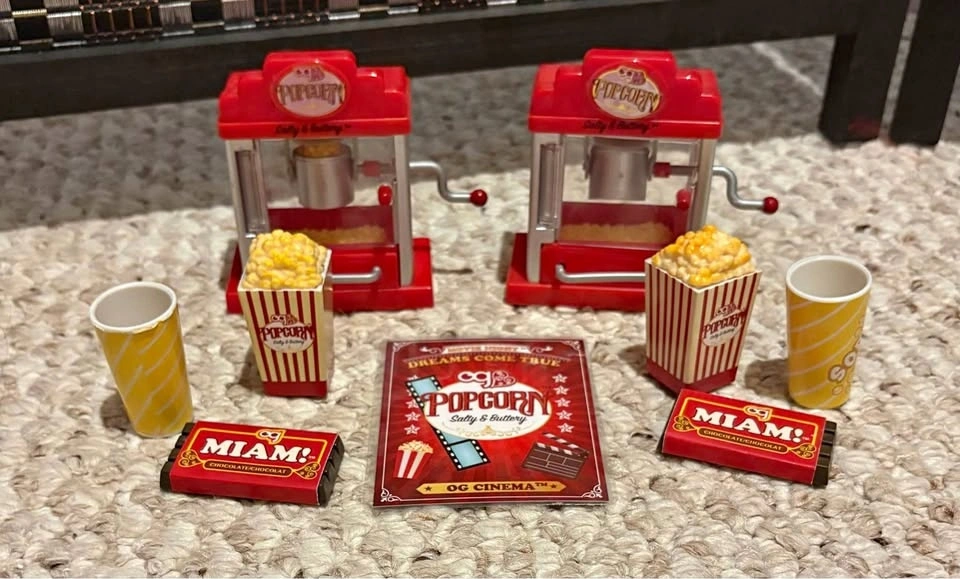 Fun Our Generation doll movie night set featuring two popcorn machines, popcorn tubs, drink cups, chocolate bars, and OG Cinema ticket card. All pieces are clean and in excellent condition. From a smoke-free home. LaSalle pickup. Check out my other American Girl listings.