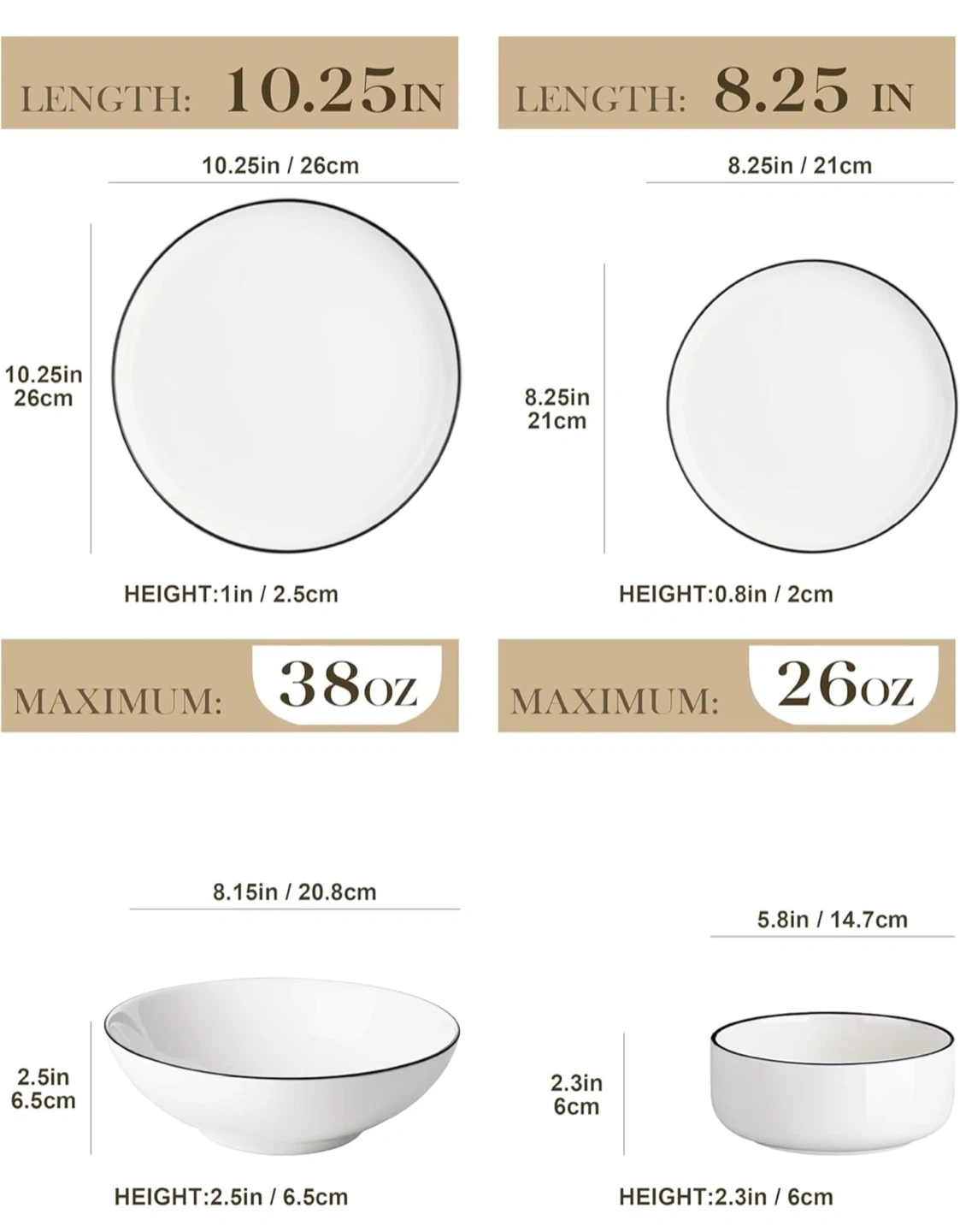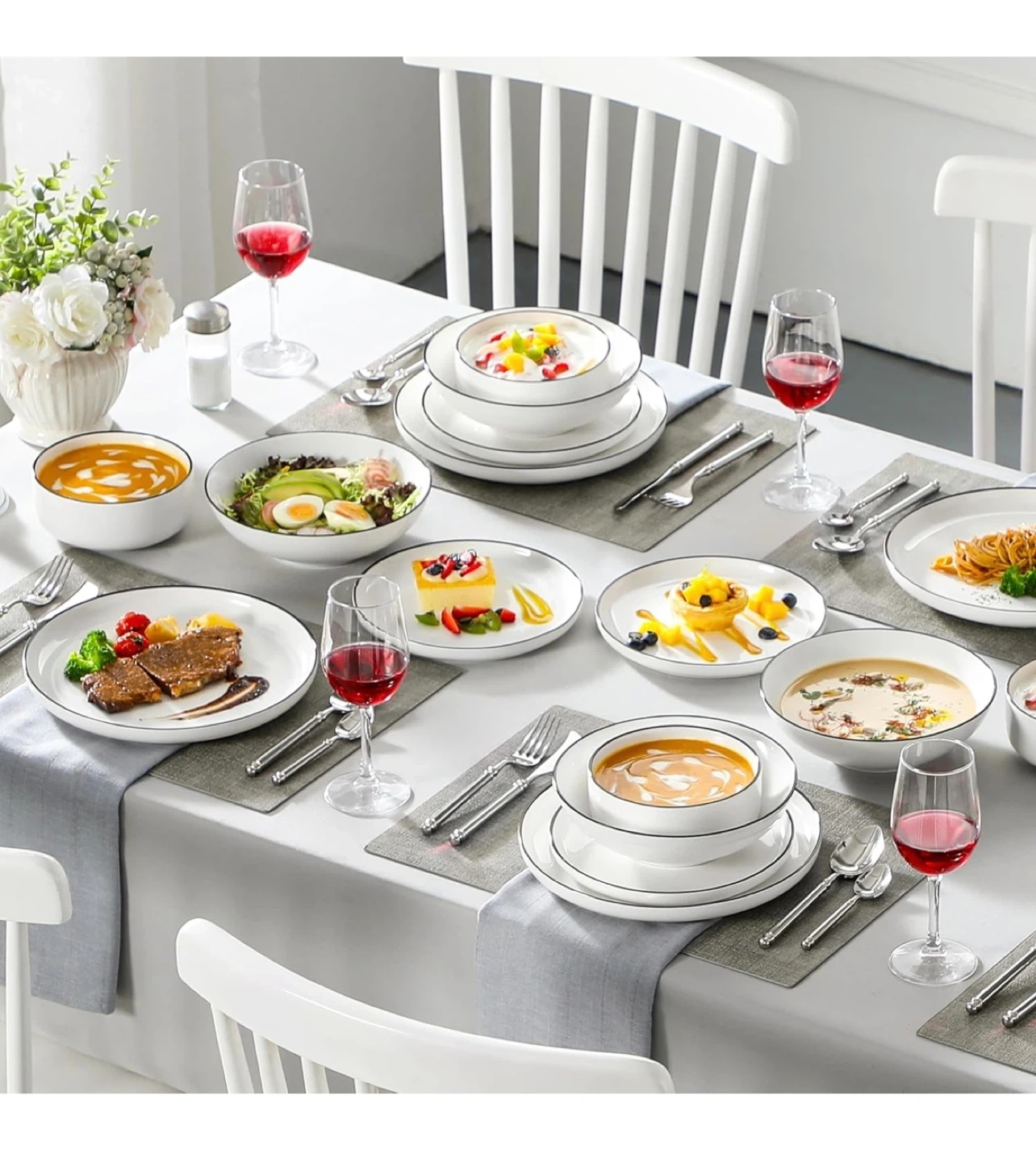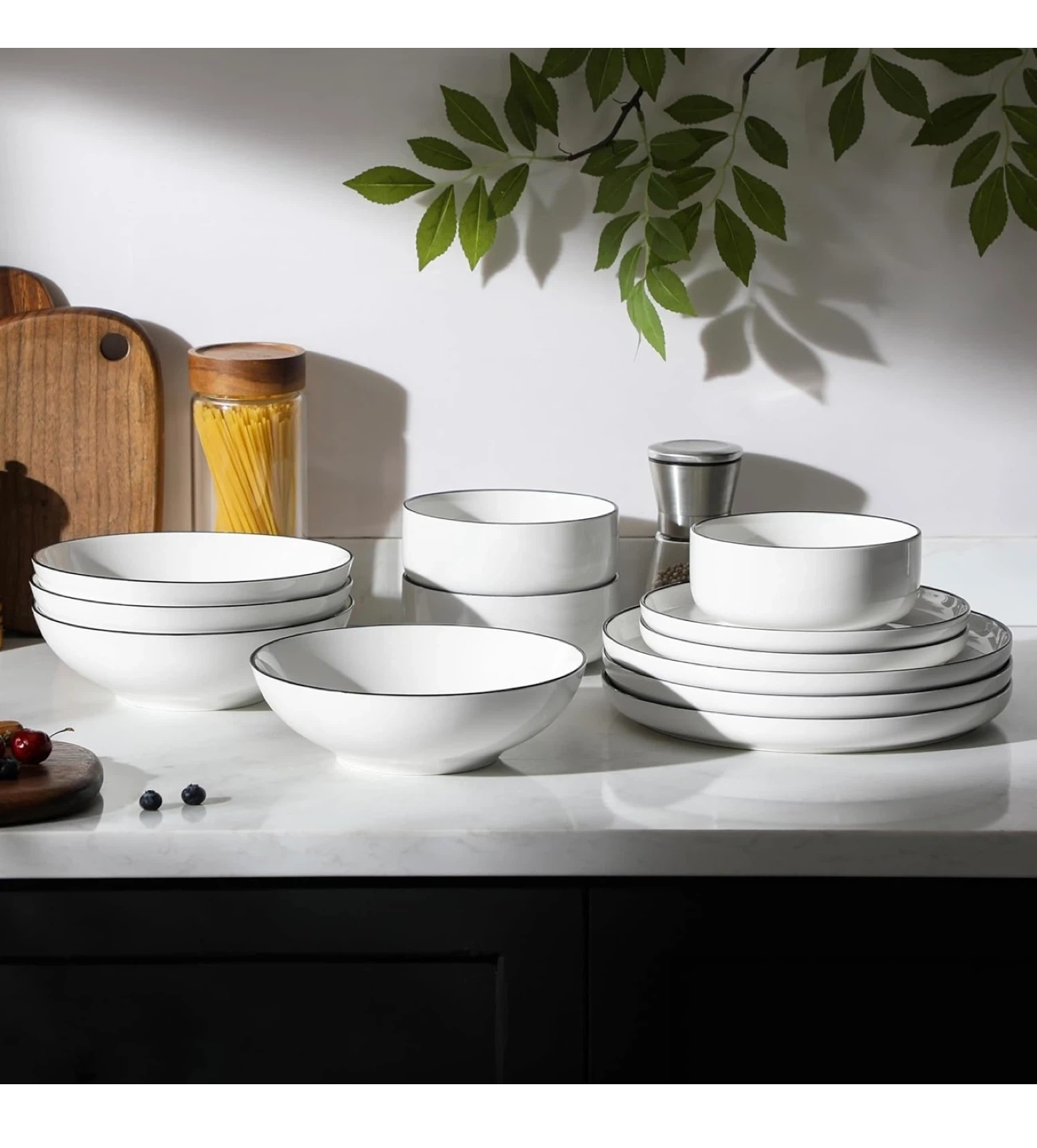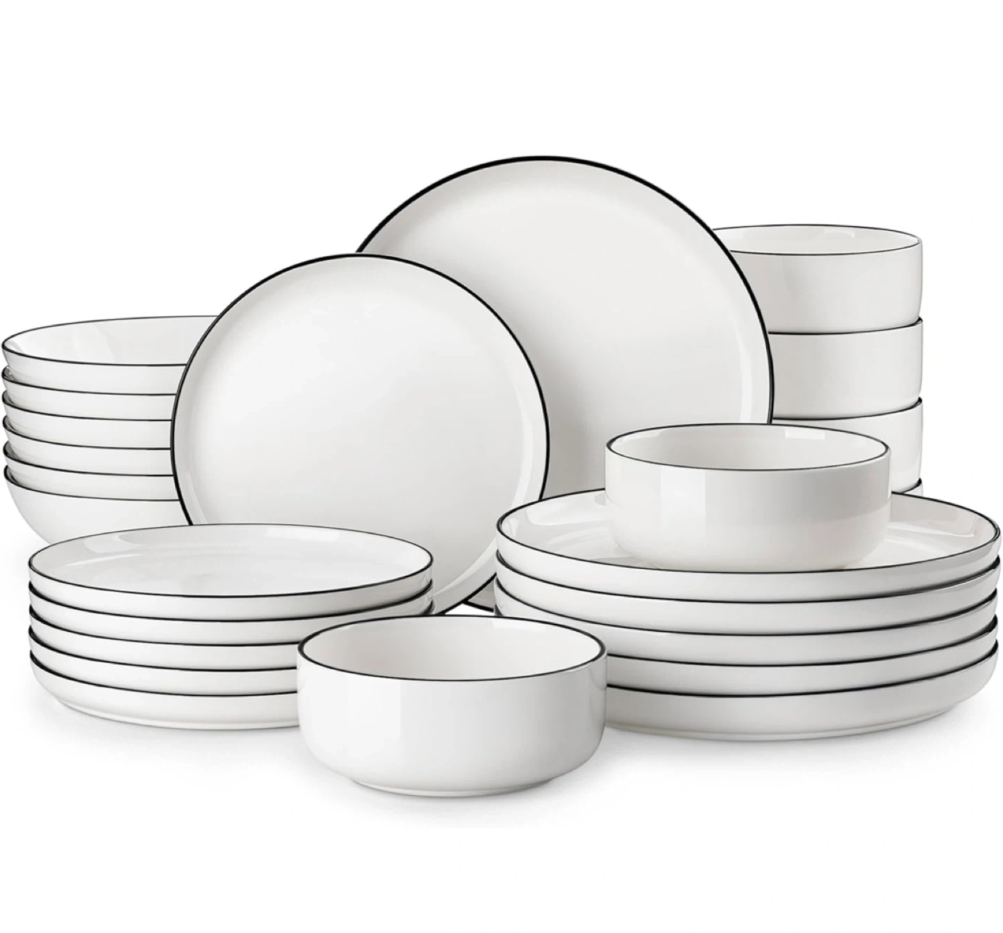 This MALACASA dinnerware set includes white plates and bowls with a classic black rim. They're microwave, dishwasher, oven, and freezer safe. Made of lead-free material for your safety.