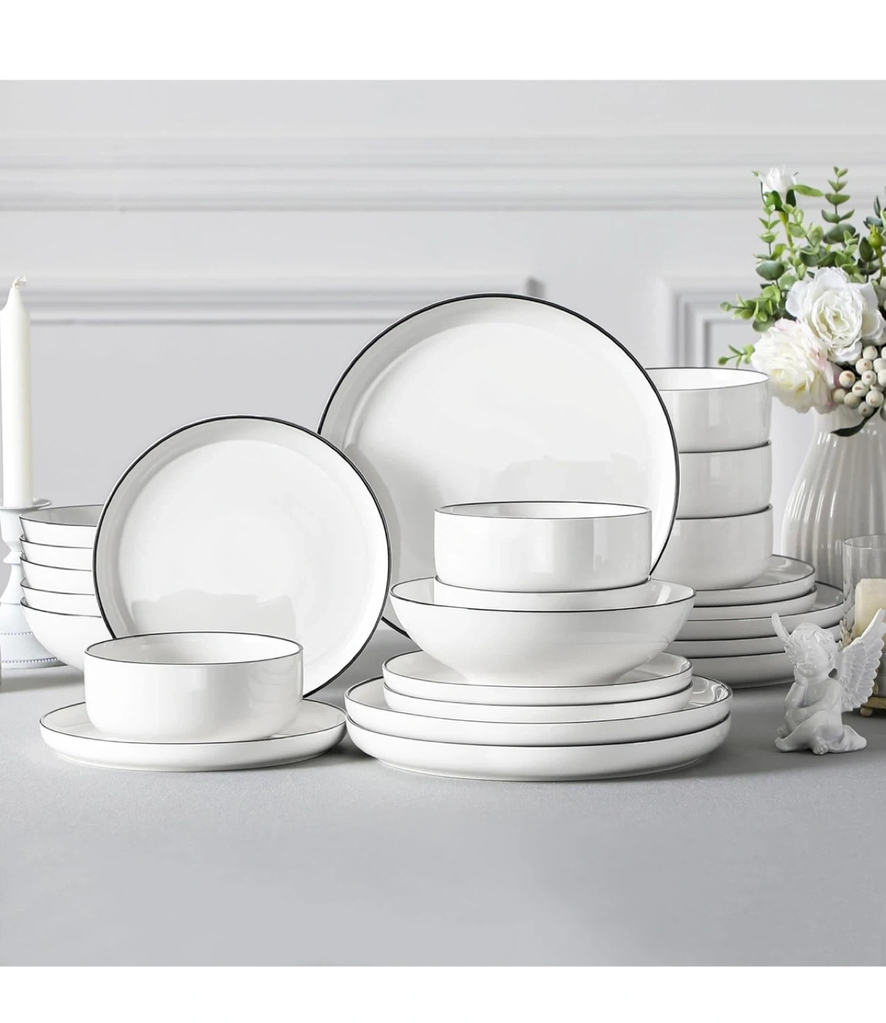 MALACASA White Dinnerware Set with Black Rim