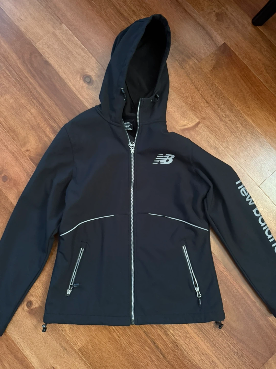 This is a black New Balance hooded jacket. It's size medium (M/M) and made in Vietnam. The jacket features a full zip front and zippered pocketsee.