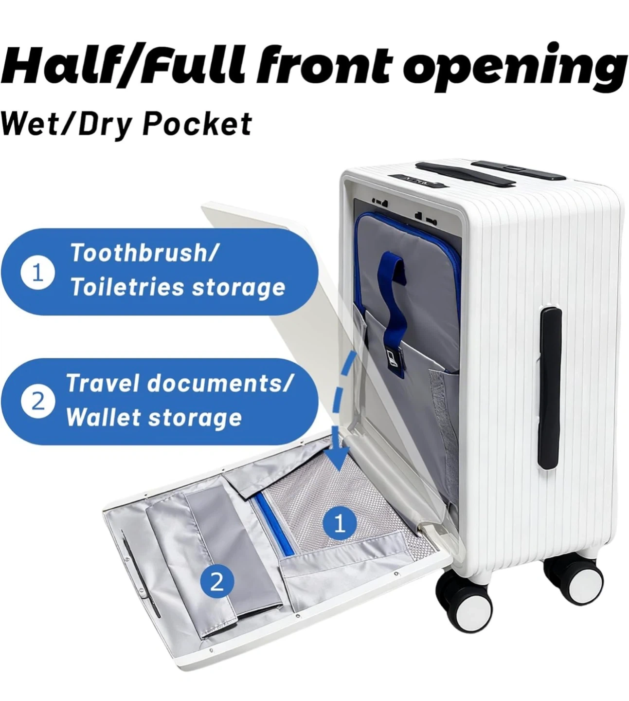 • Convenient Access: Front opening design allows for quick access to essentials like laptops, passports, and wallets without fully opening the luggage.