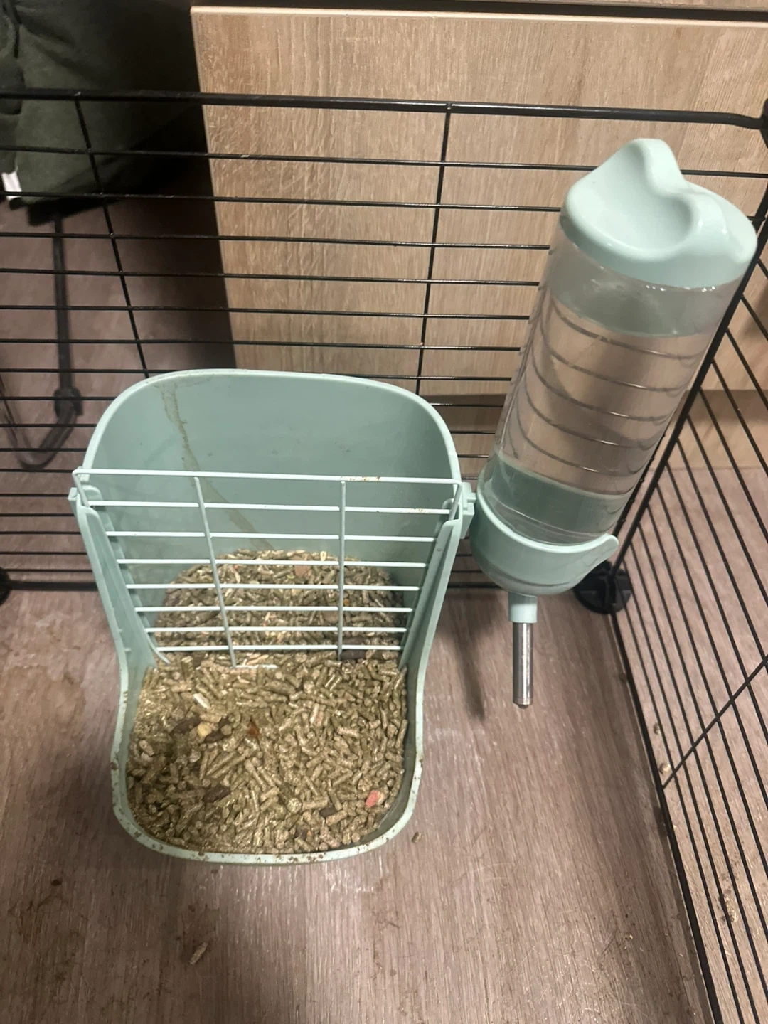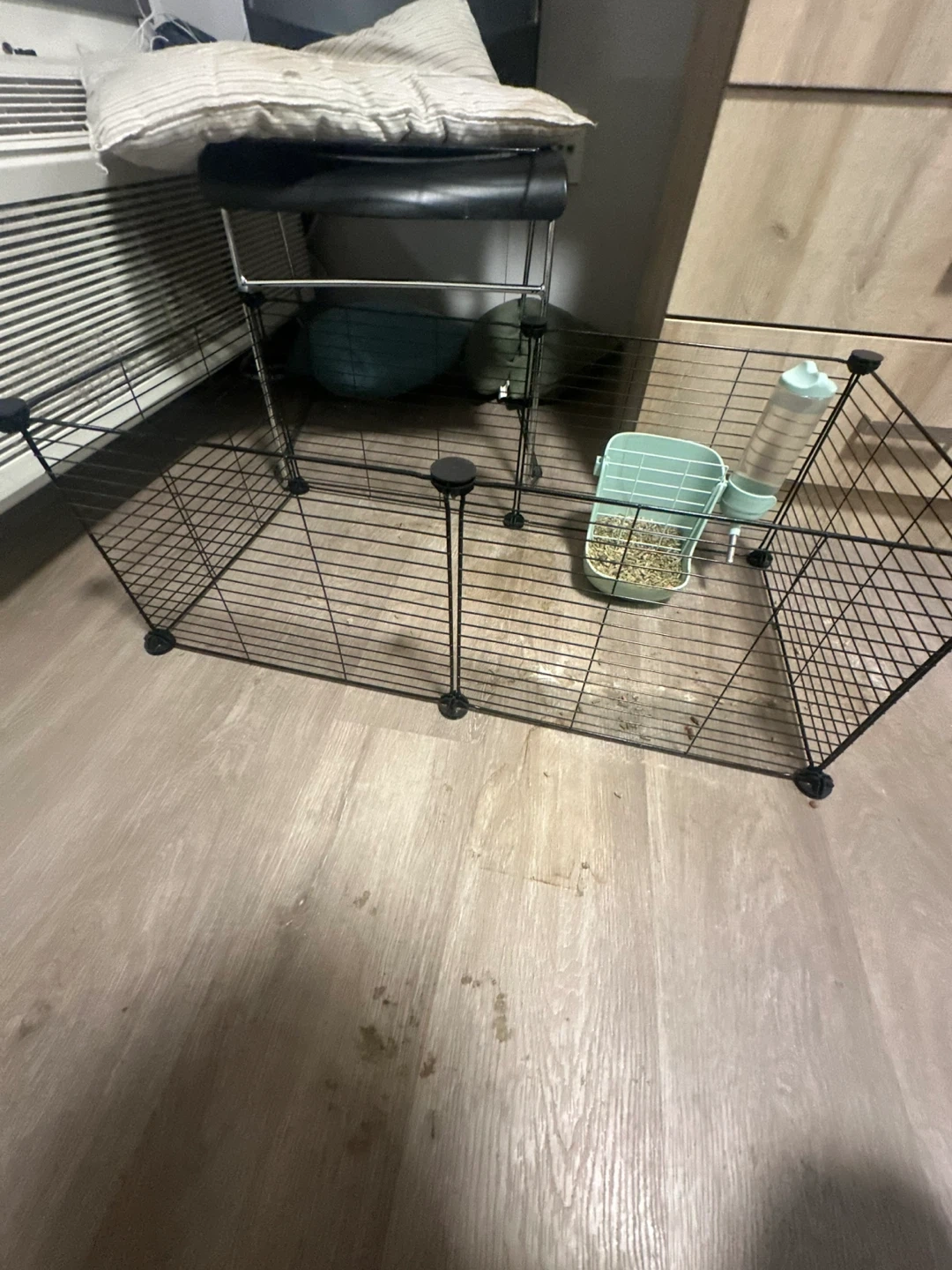 Black wire grid playpen for small pets. Includes a green food bowl with a grate and a water bottle dispenser. Easy to set up and reconfigure. Great for providing pets with a safe space to roam.