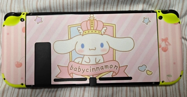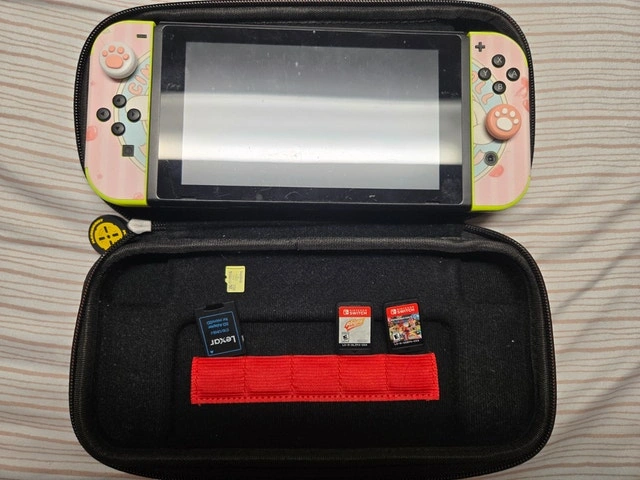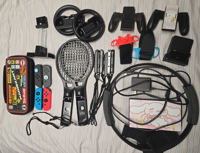 Full Nintendo Switch bundle featuring an adorable Baby Cinnamoroll-themed skin and joystick grips. Perfect for gamers who love a cute setup, it includes the Switch console, Joy-Cons, controllers, multiple accessories, and games like Mario Kart 8 Deluxe and Ring Fit Adventure. Comes with a 256GB microSD card for plenty of storage. Key Features: Nintendo Switch console with screen protector and Baby Cinnamoroll design skin, 2 official Joy-Cons + 2 third-party Joy-Cons, Full Ring Fit Adventure set with leg strap and Ring-Con, Mario Kart 8 Deluxe game cartridge included, Extra accessories: tennis rackets, steering wheels, multiple Joy-Con grips, charging dock, and more. Includes Mario Kart-themed hard case for carrying. 256GB microSD card installed. Condition: Used - Good. For Sale By: Owner.