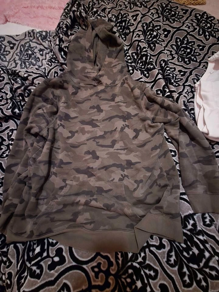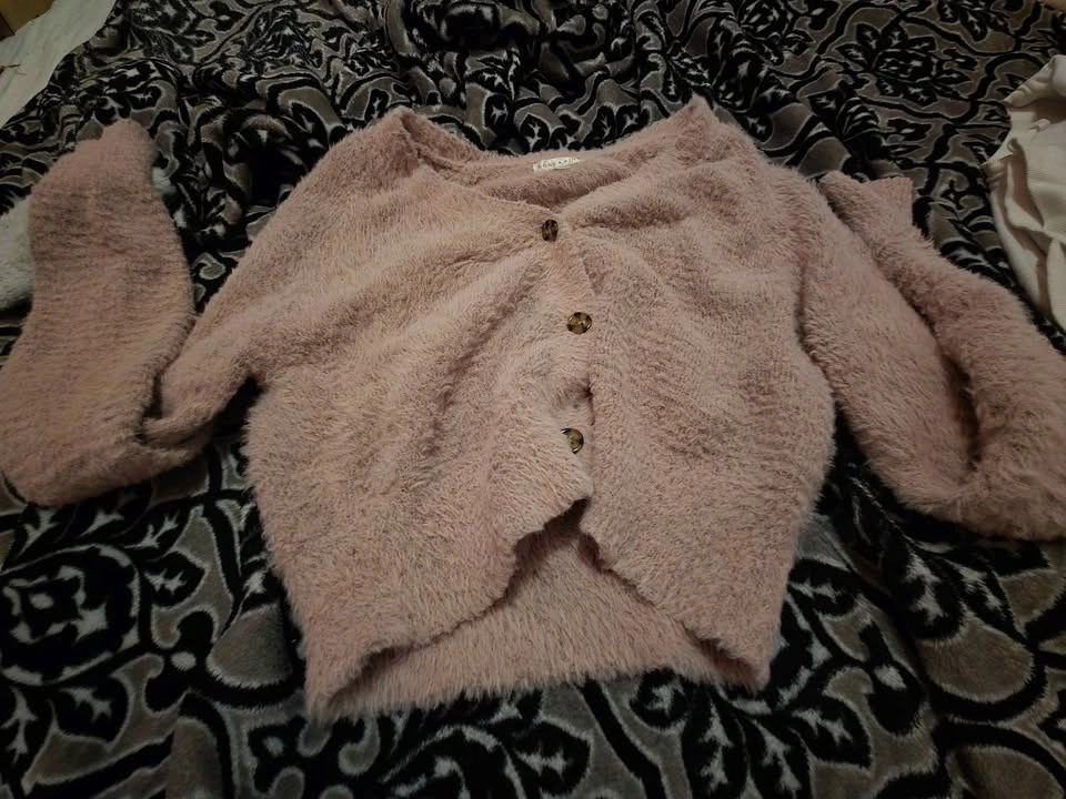 Cleaning out my closet and need these gone tonight! Three super cozy pieces for one low price. Pink Rose + Vine Fuzzy Cardigan (Size small), White Rose + Vine Fuzzy Cardigan (Size small), Camo Pullover Hoodie - Great for layering, size medium-large.
