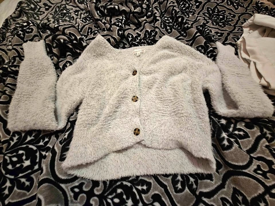 Cleaning out my closet and need these gone tonight! Three super cozy pieces for one low price. Pink Rose + Vine Fuzzy Cardigan (Size small), White Rose + Vine Fuzzy Cardigan (Size small), Camo Pullover Hoodie - Great for layering, size medium-large.
