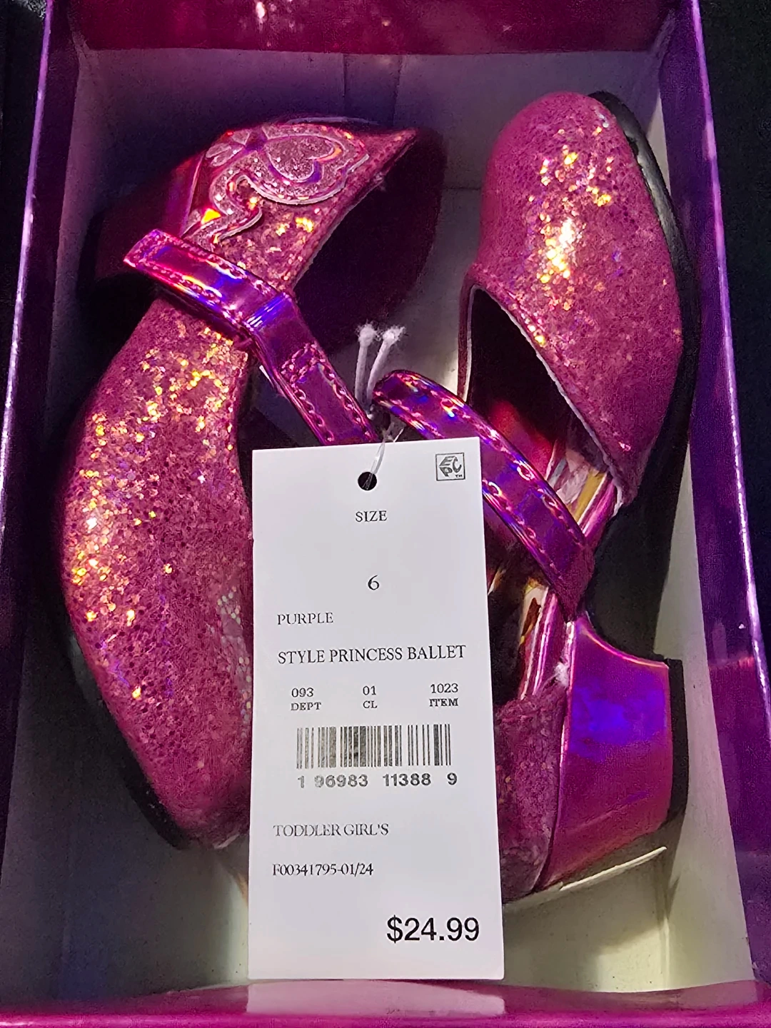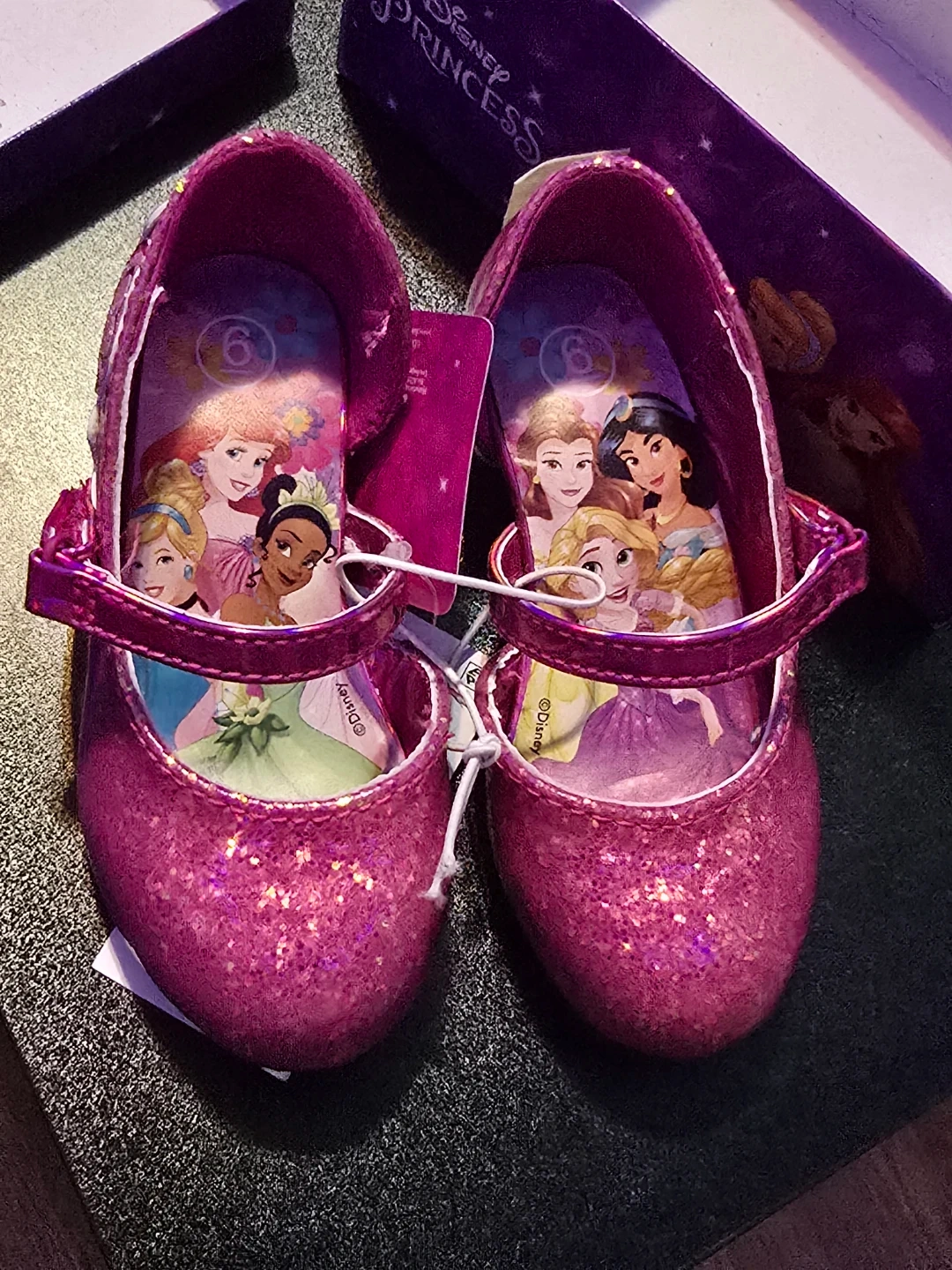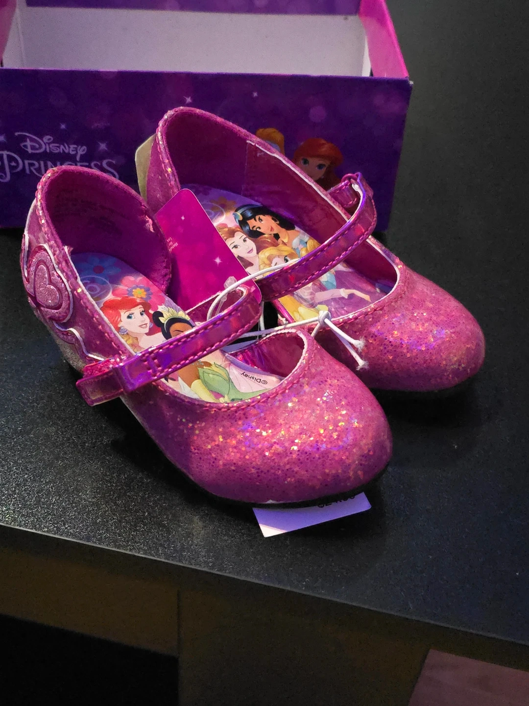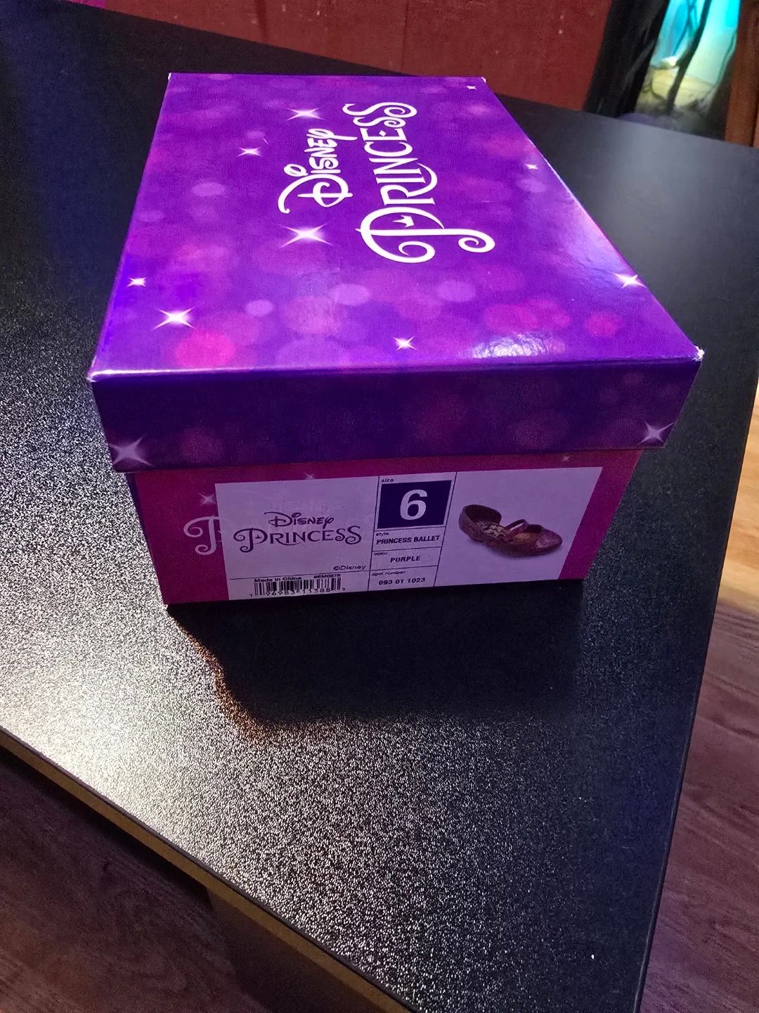 Toddler girl's Disney Princess ballet shoes in purple(actual color looks pink). Glitter finish with strap closure. Brand new Includes original box. Asking $15