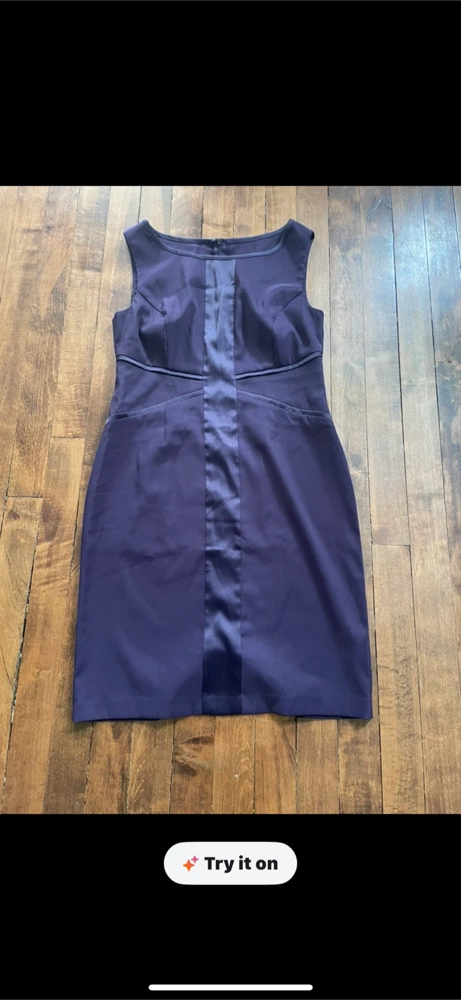This Connected Apparel dress is a lovely shade of purple. It features a satin panel down the front and has a flattering sheath silhouette. It's a sleeveless design with a boat neckline. Made in Sri Lanka. Size 6.
