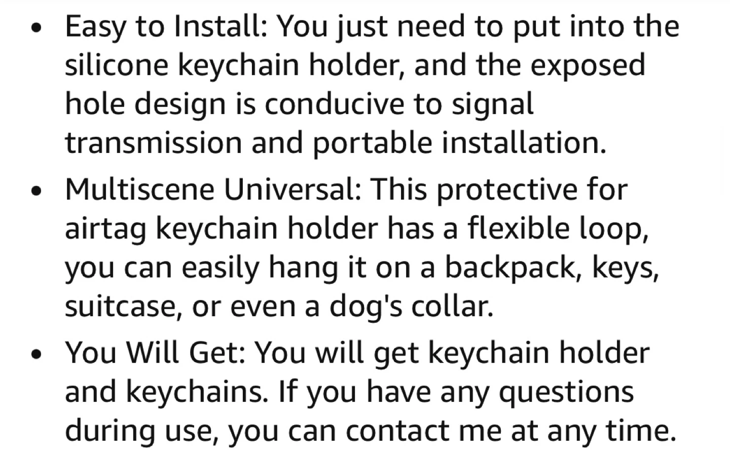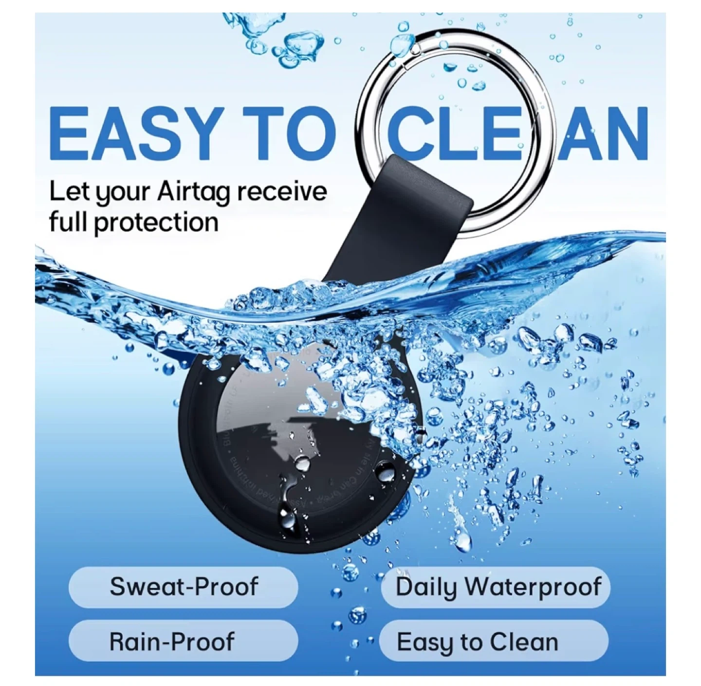 This AirTag cases are made of soft silicone rubber. They offer a smooth surface and strong structure for protection. The cases are sweat-proof, rain-proof, and easy to clean. They come with a keychain loops and an extra rings. It's designed to make your AirTag a trackable keychain.