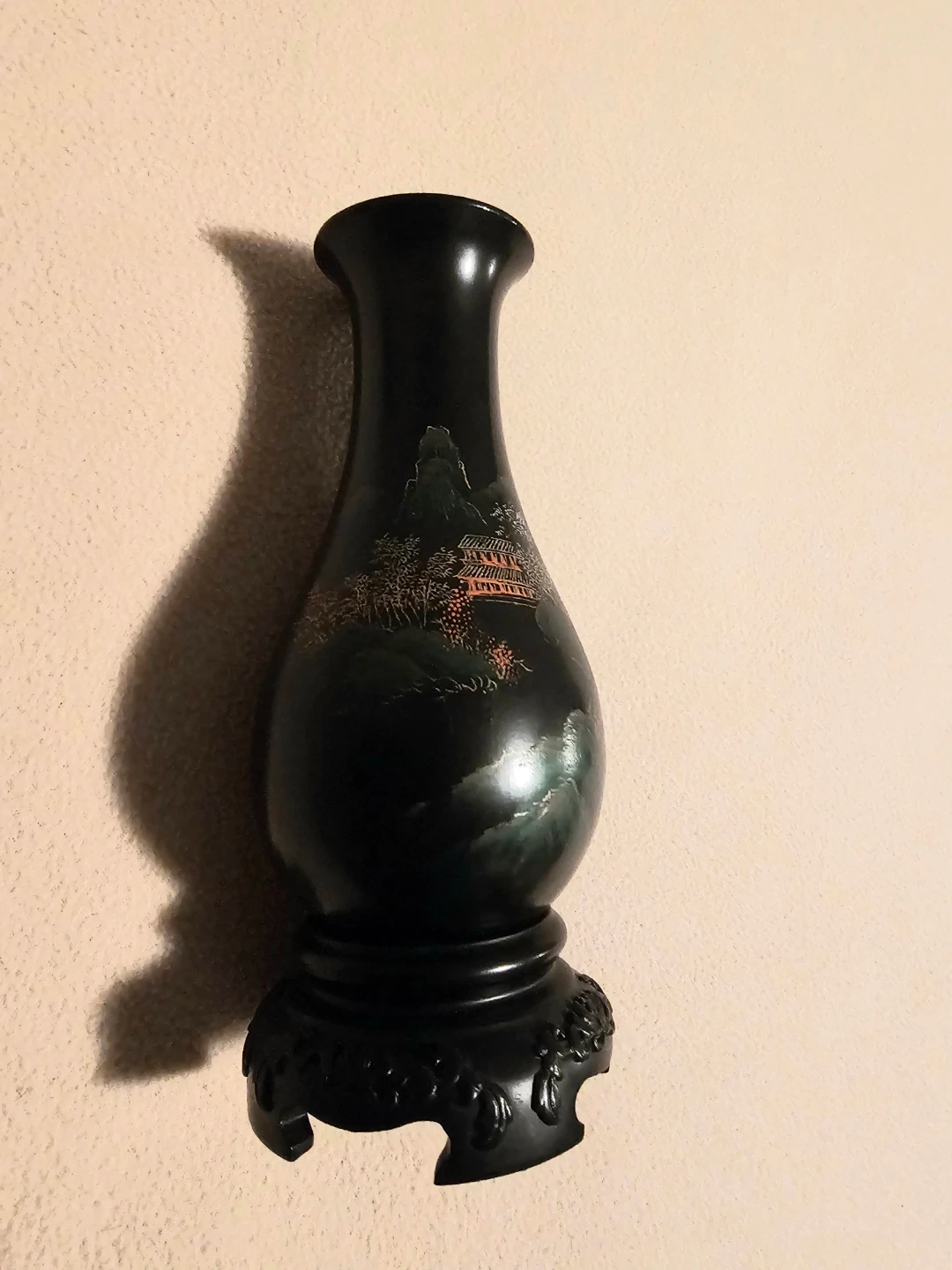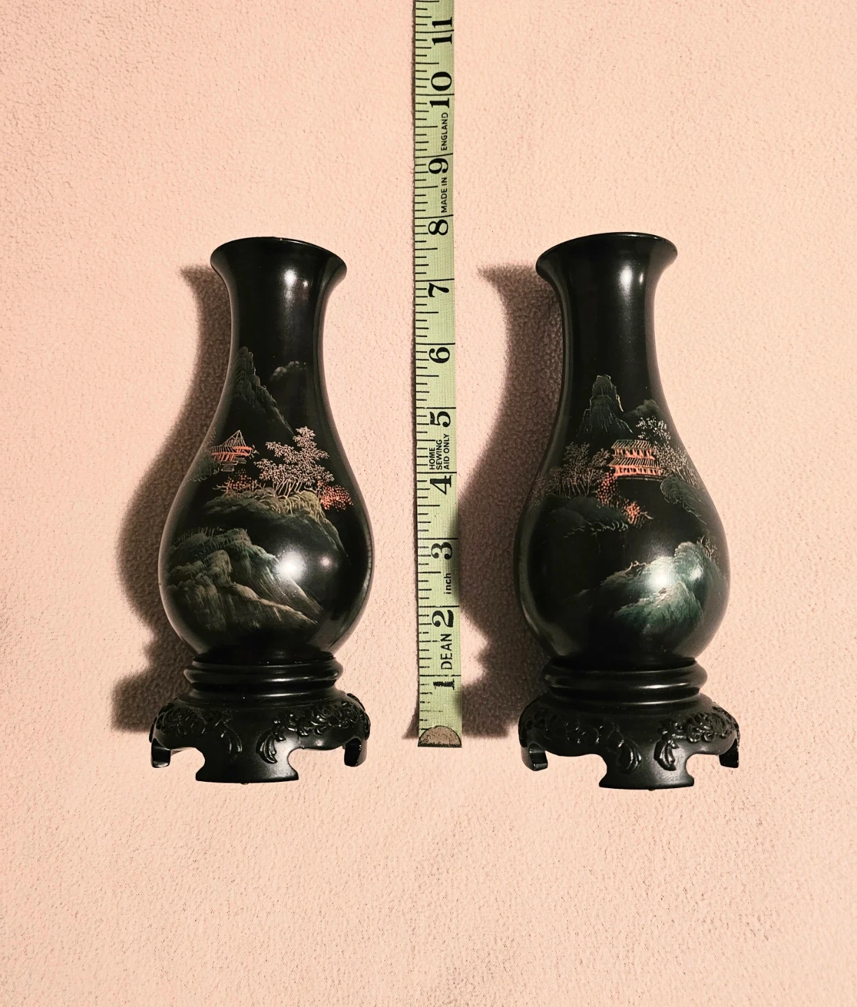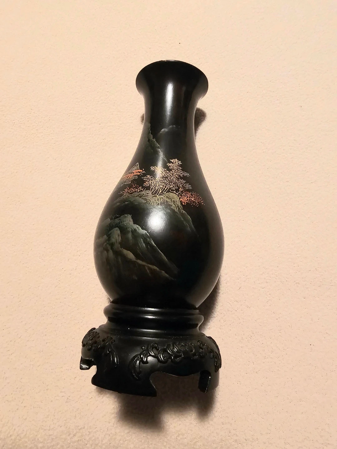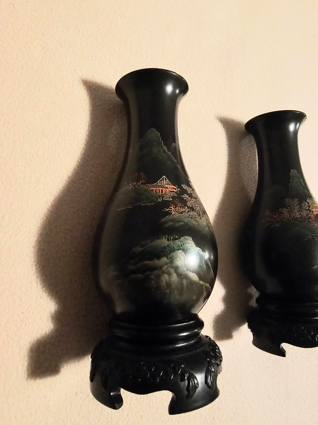 A lovely pair of dark vases featuring a detailed hand-painted scenic Asian design with pagodas and mountains. Each vase measures 7 inches tall and sits on a decorative black wood stand. Light weight but last photo shows wood, each vase has 4 finishing nails on the bottom of base. $5 Each or $10 for the pair.