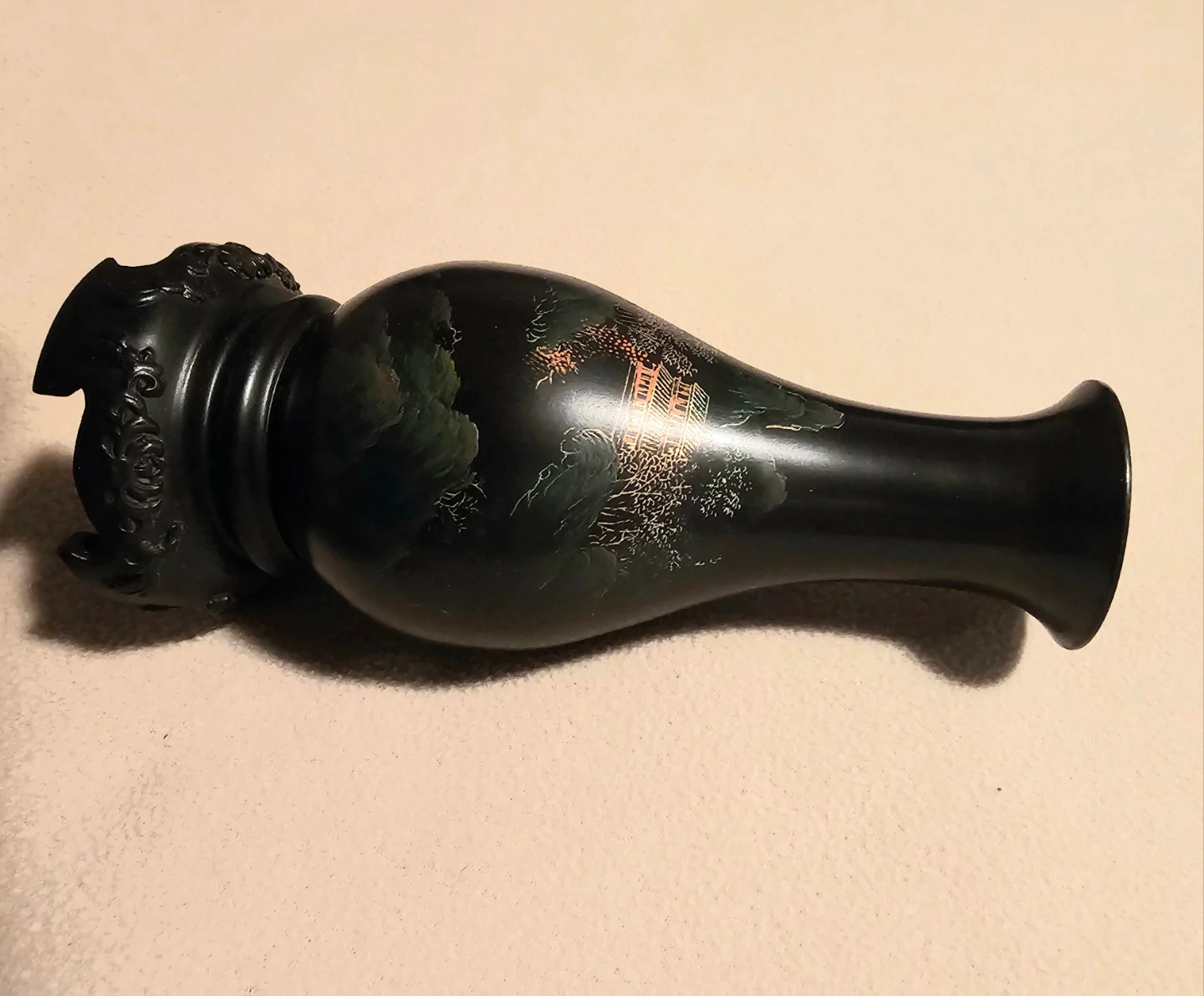 A lovely pair of dark vases featuring a detailed hand-painted scenic Asian design with pagodas and mountains. Each vase measures 7 inches tall and sits on a decorative black wood stand. Light weight but last photo shows wood, each vase has 4 finishing nails on the bottom of base. $5 Each or $10 for the pair.