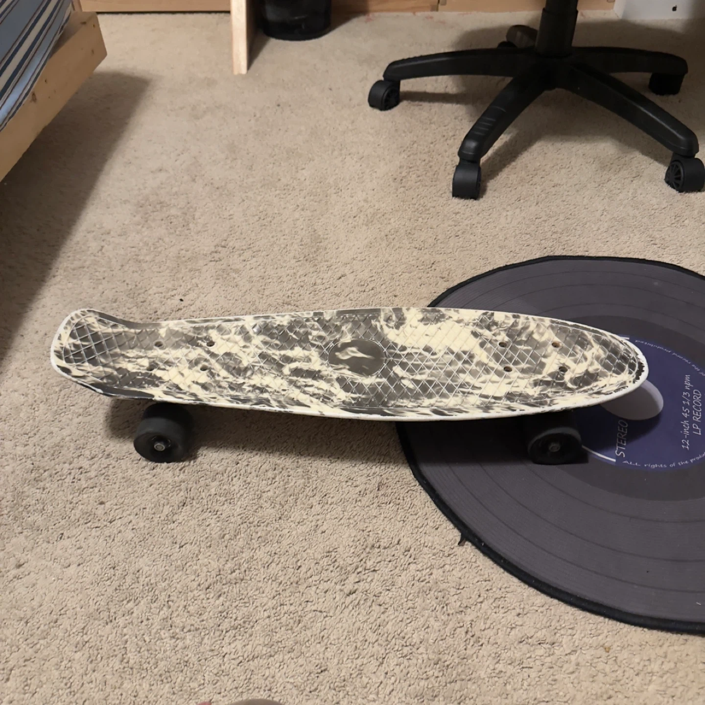 A classic Quarter board style skateboard with a marbled black and cream pattern. It's a compact cruiser, perfect for quick trips. Trucks and wheels are black.