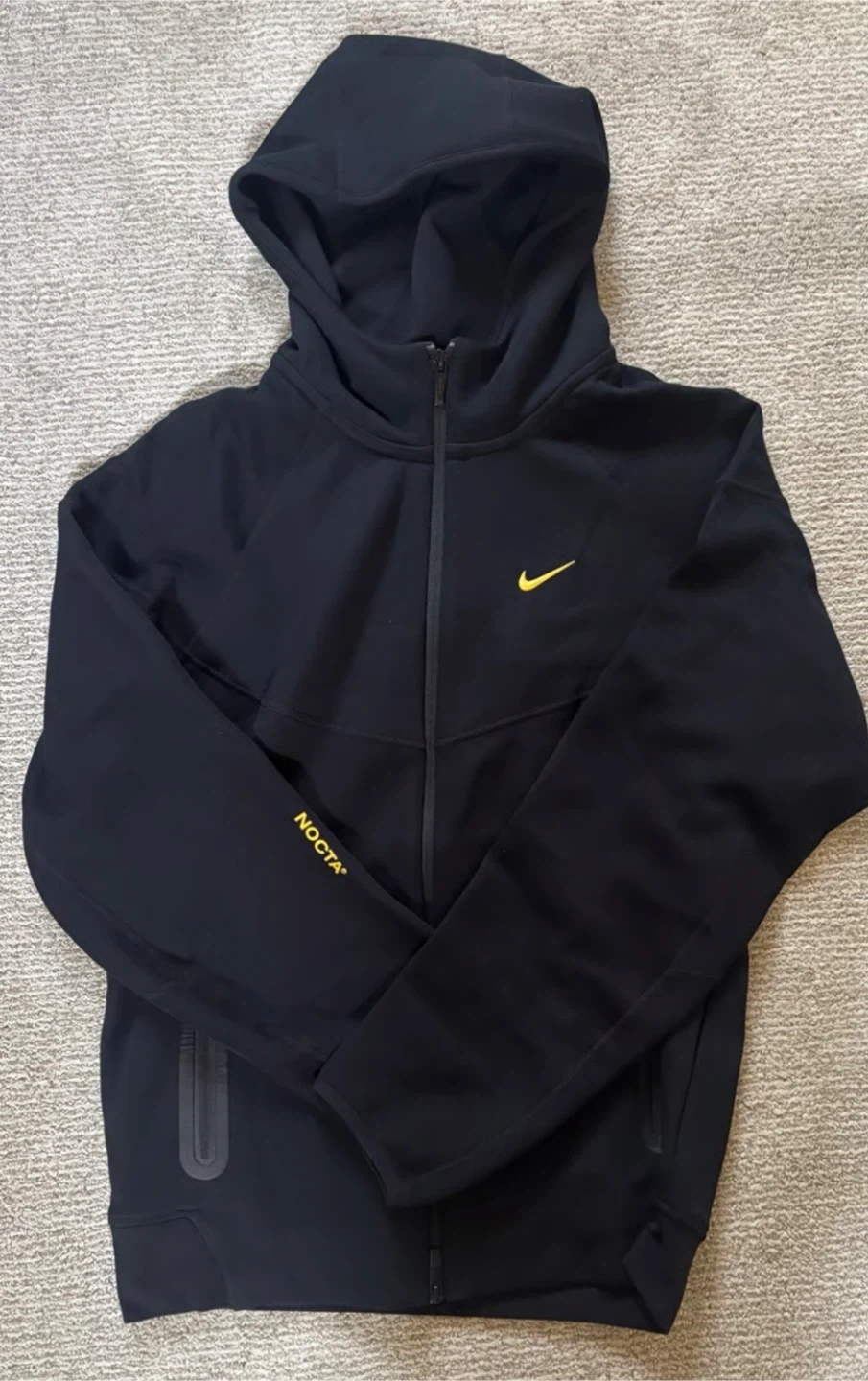 Black Nike NOCTA zip-up hoodie with yellow accents. Features a full zip closure and zippered pockets. Includes the NOCTA logo on the sleeve.