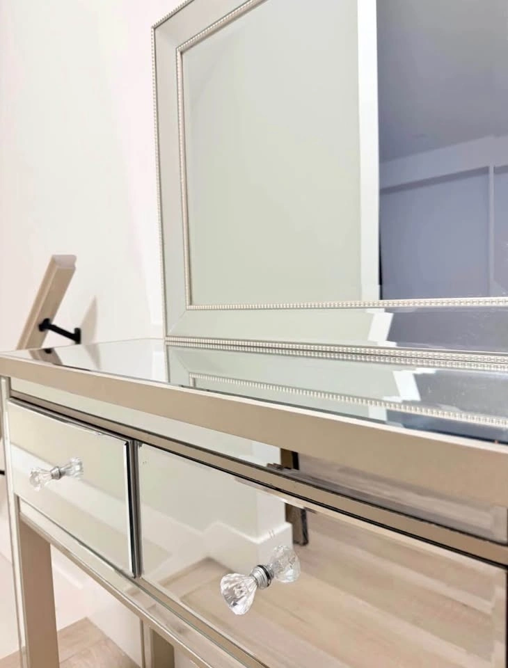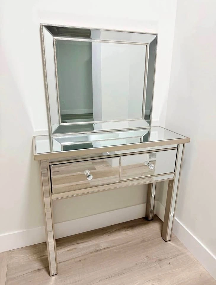Sleek, modern 2-piece vanity with matching mirror. Excellent condition, clean, sturdy, and well maintained. Paid $700 before tax. Perfect for a modern bedroom or dressing area. Local pickup.