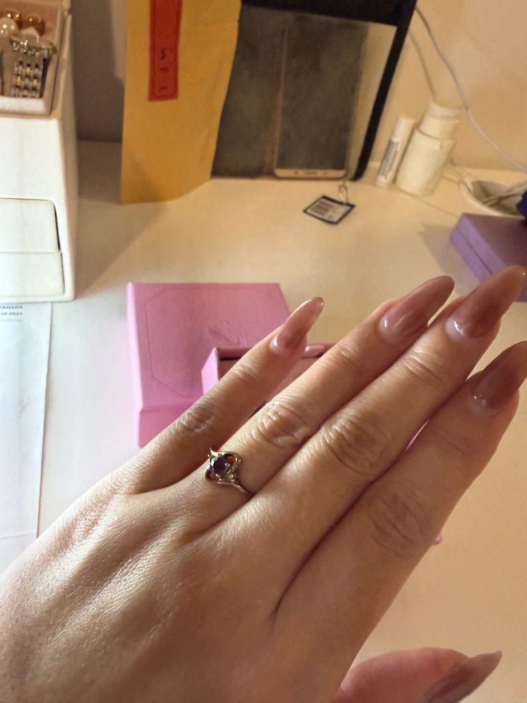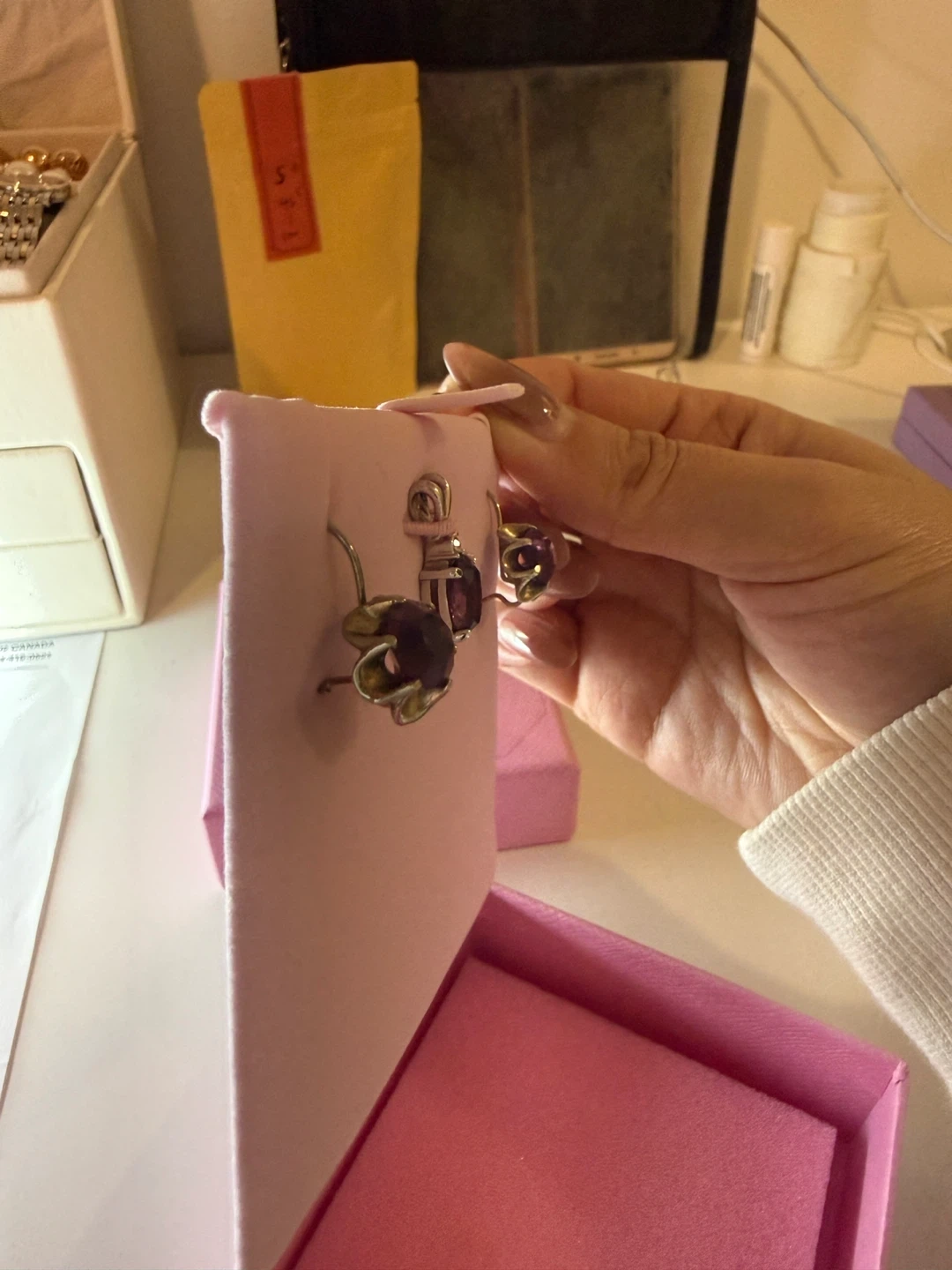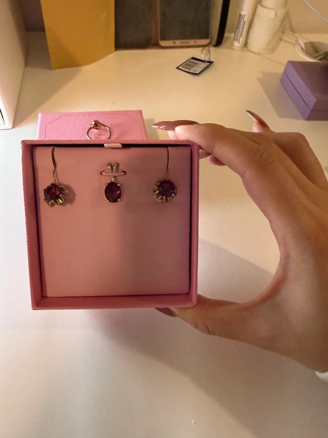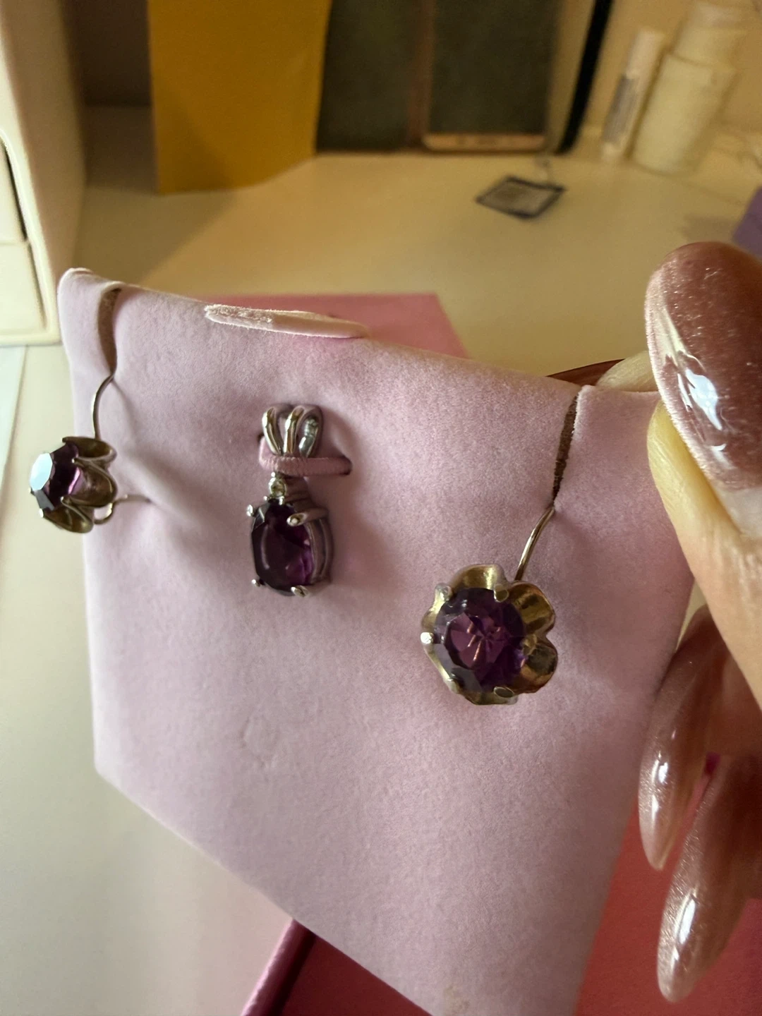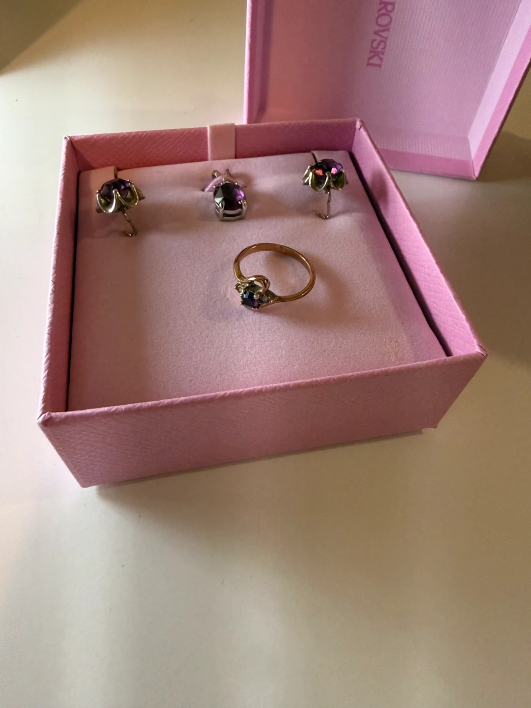 Each piece is adorned with amethyst stones set in a floral design. The set comes in a pretty pink presentation box.