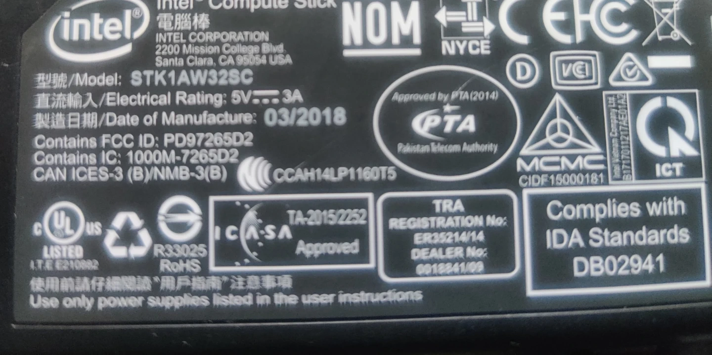This Intel Compute Stick is a compact computer that plugs into an HDMI port. It features USB ports and includes the necessary power adapter. Date of manufacture is March 2018.