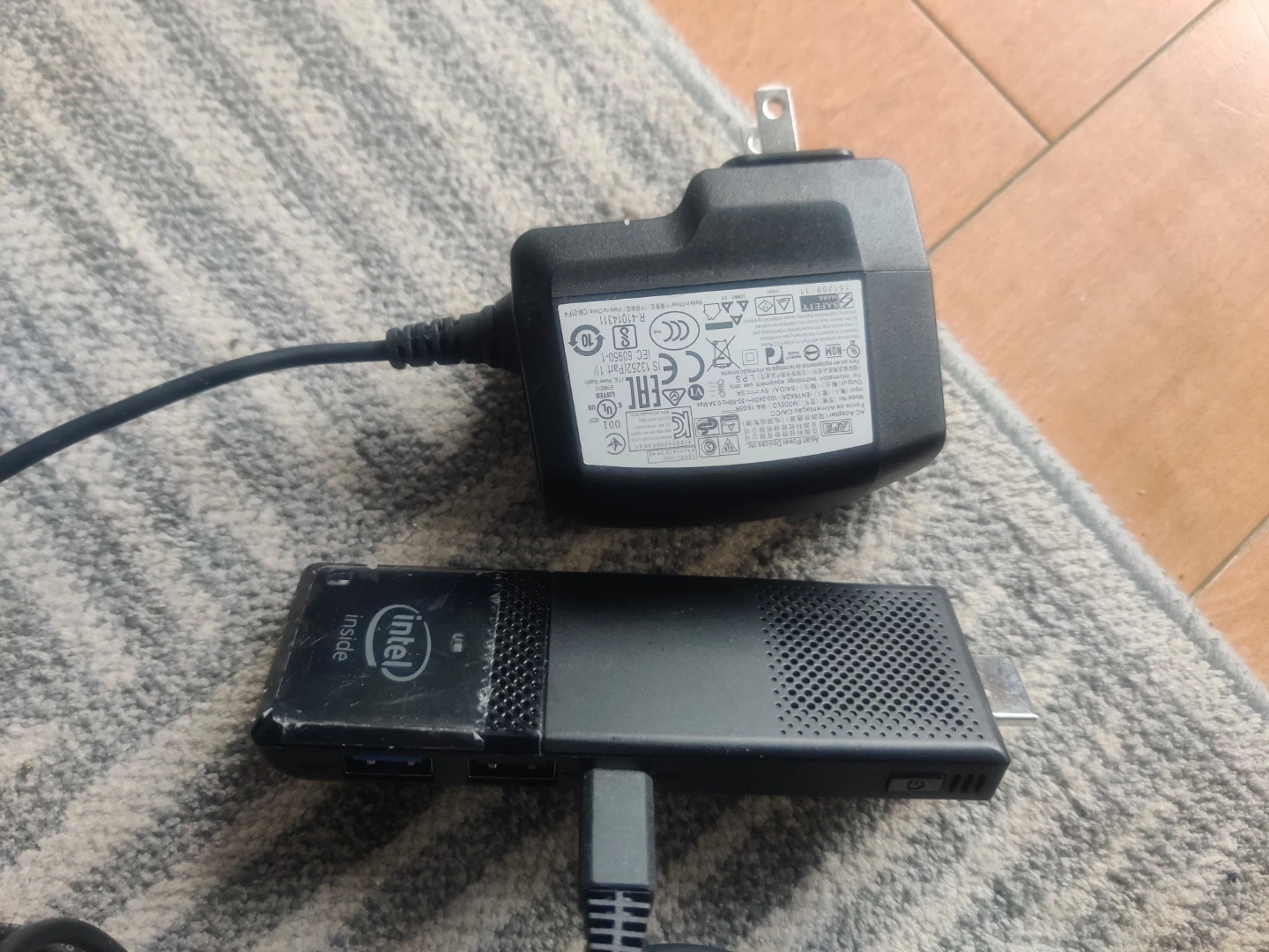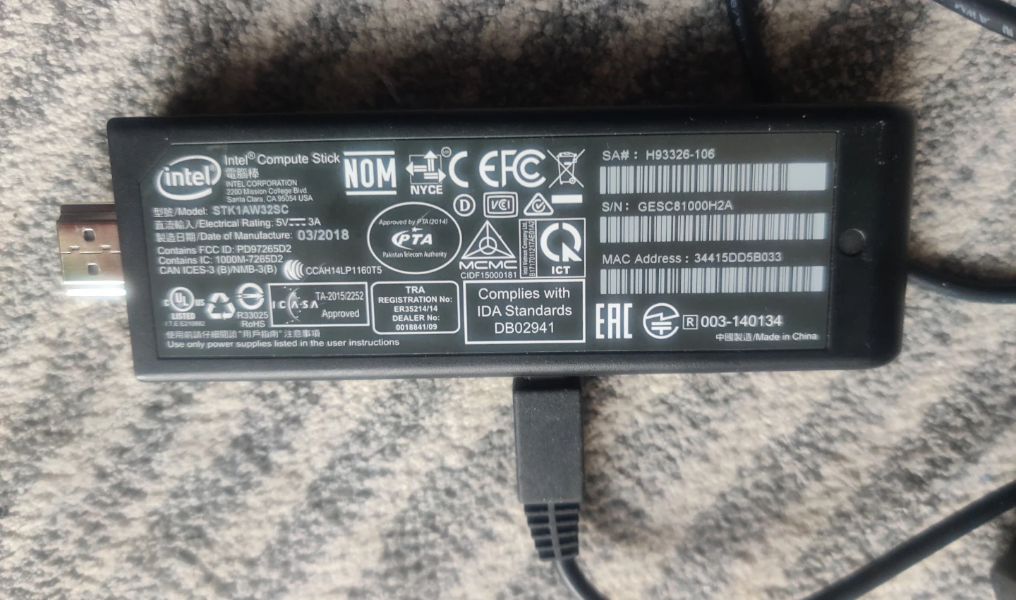 This Intel Compute Stick is a compact computer that plugs into an HDMI port. It features USB ports and includes the necessary power adapter. Date of manufacture is March 2018.