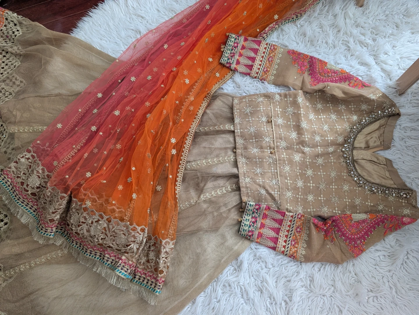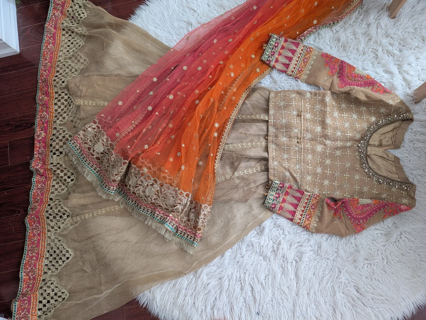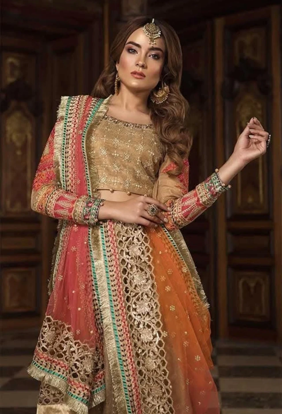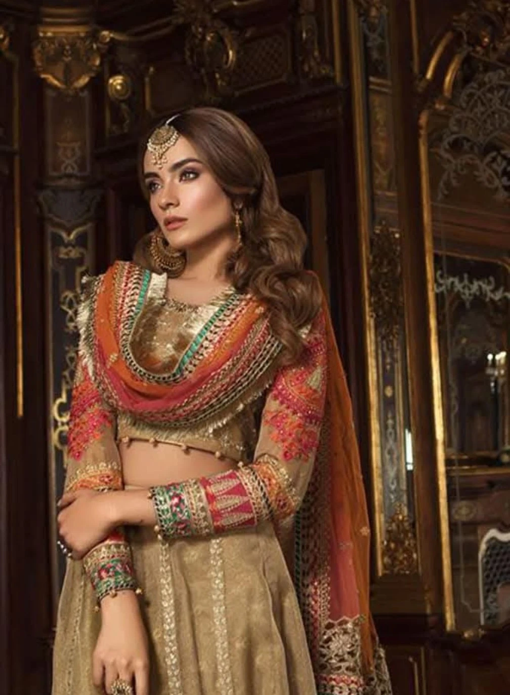 Beautifully embellished original Maria B Lehengas with a coordinating dupatta. This outfit features intricate embroidery and a flowing design. It's perfect for special occasions and festive gatherings.