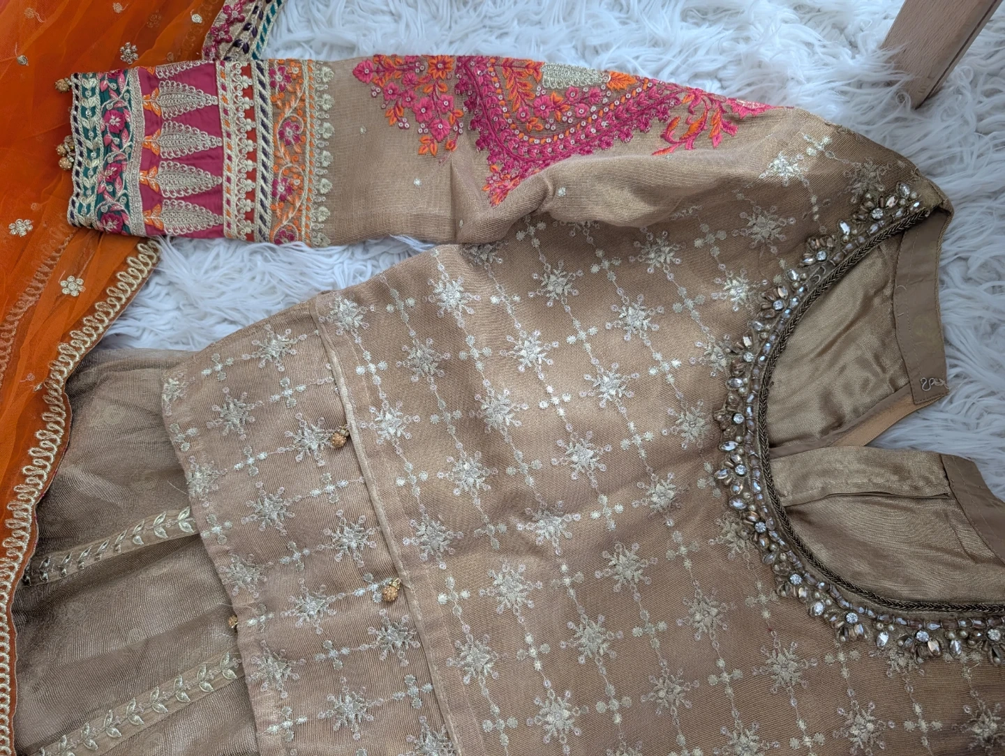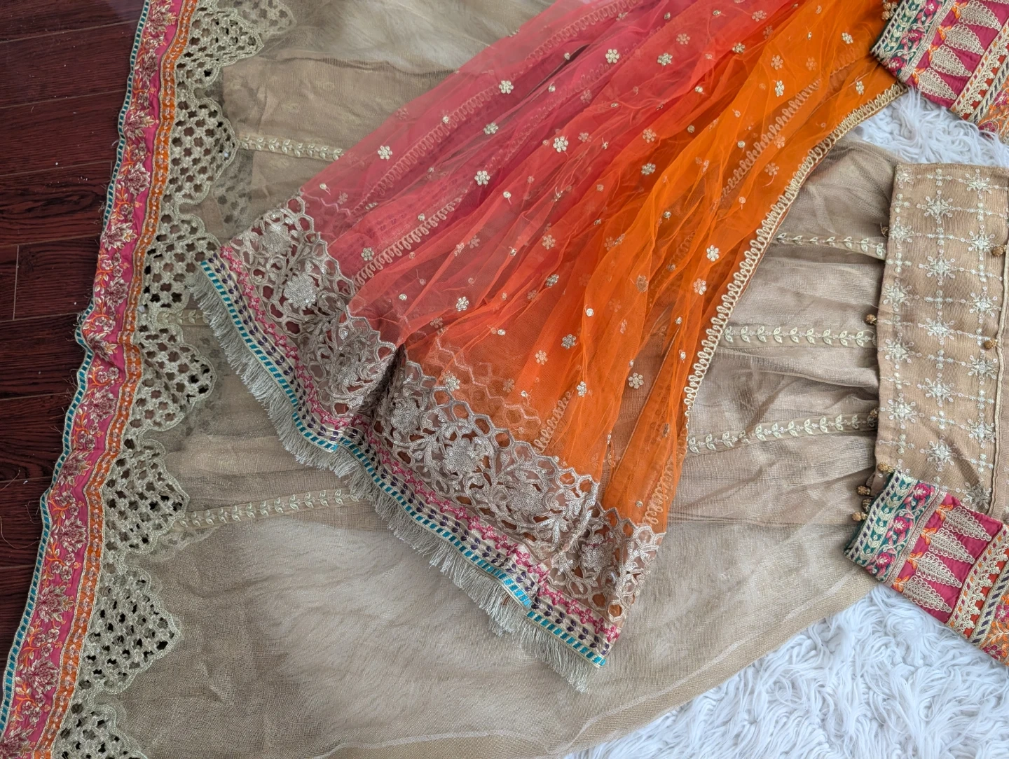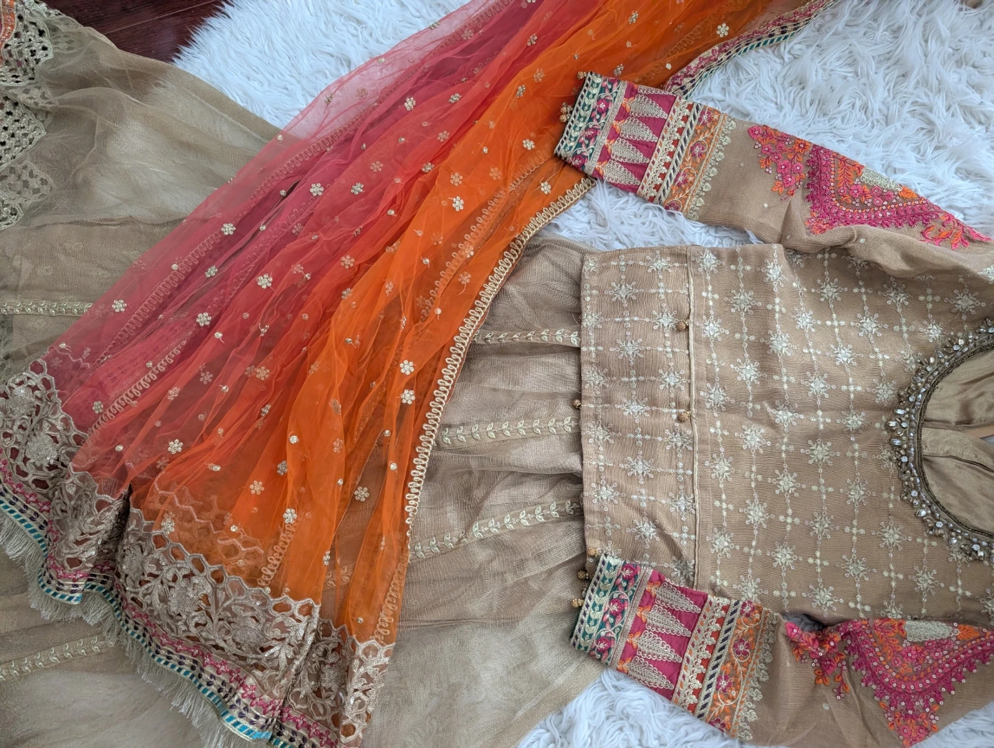 Beautifully embellished original Maria B Lehengas with a coordinating dupatta. This outfit features intricate embroidery and a flowing design. It's perfect for special occasions and festive gatherings.