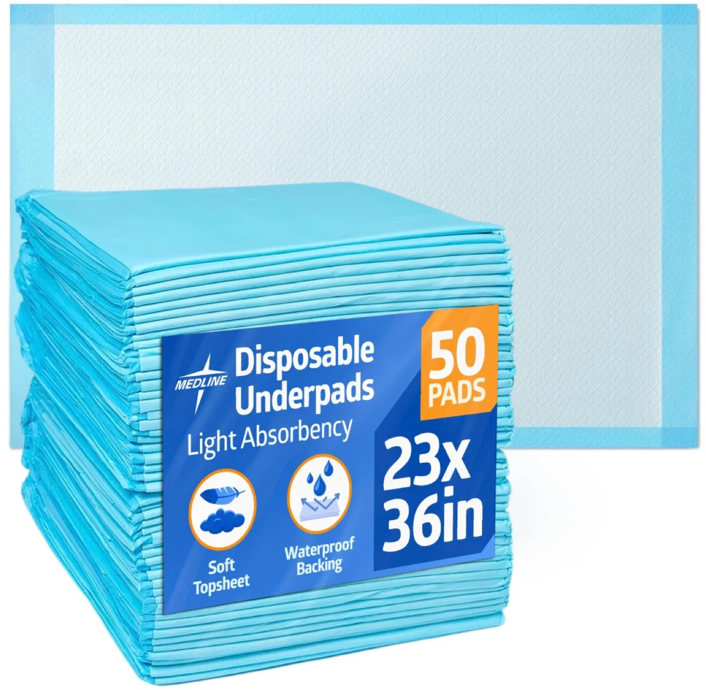 These Medline disposable underpads offer a soft, absorbent top sheet with a waterproof backing. They measure 23" x 36" and are strong and disposable. Includes 10 pads per package. Or 50 pads
