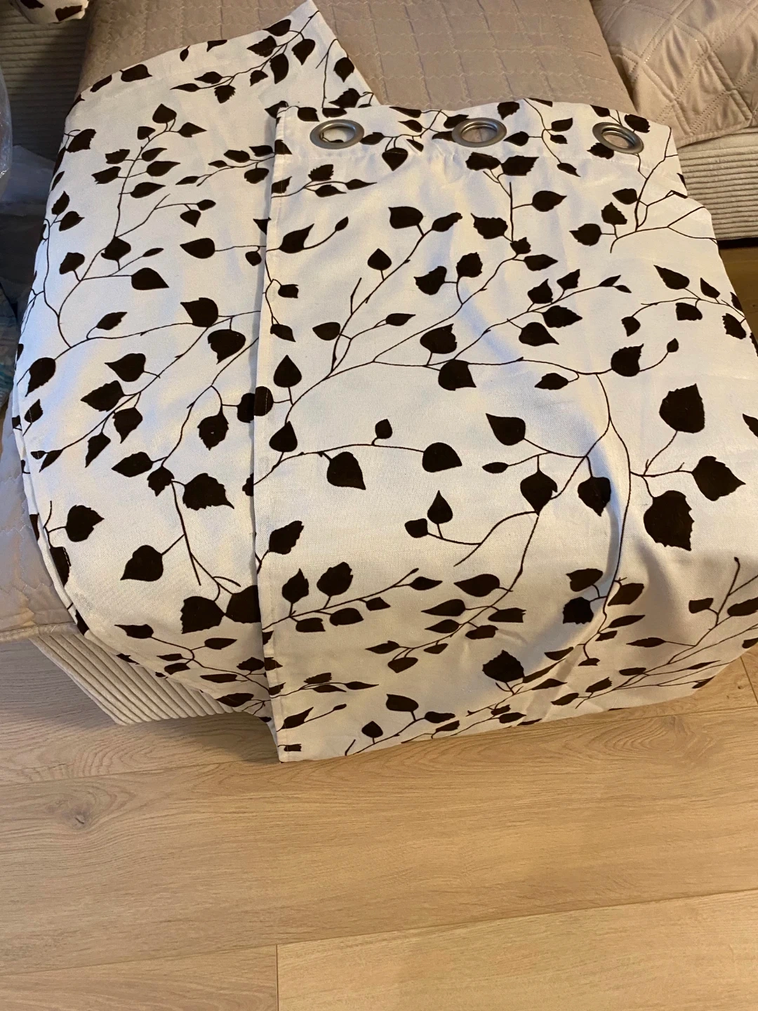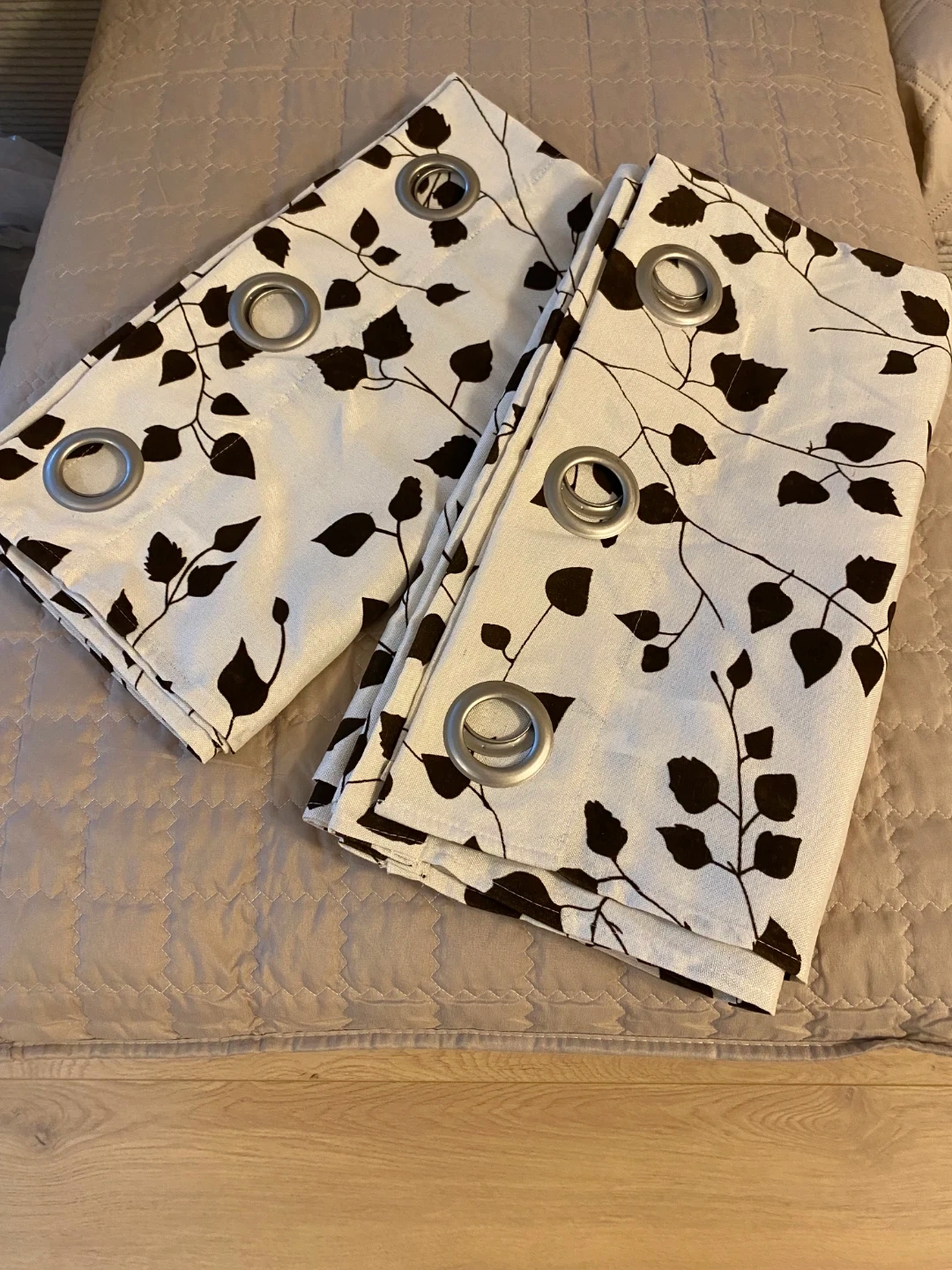 NEW! Sister bought them and before putting them up, they moved out of the country and these remained in a bag. These beautiful curtains are made with 50% polyester and 50% cotton. They measure 38 inches wide by 84 inches long.