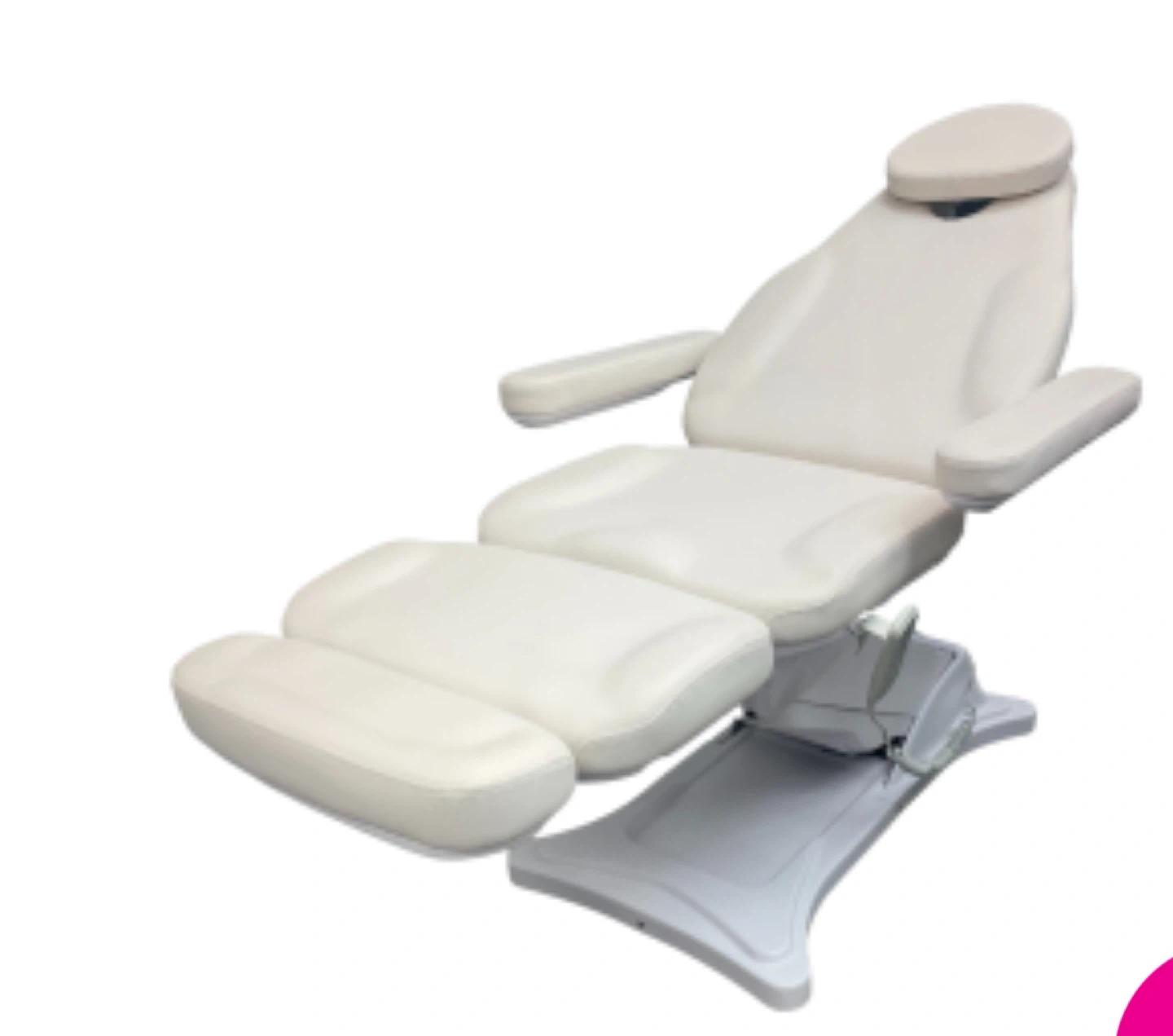 This is a white hydraulic esthetician chair with adjustable headrest and armrests. It's made with durable, easy-to-clean upholstery. The chair's hydraulic system allows for smooth height adjustments. It's suitable for salons and spas. This bed is 32.5" with the arms, 23" without the arms, and 6 feet in length.