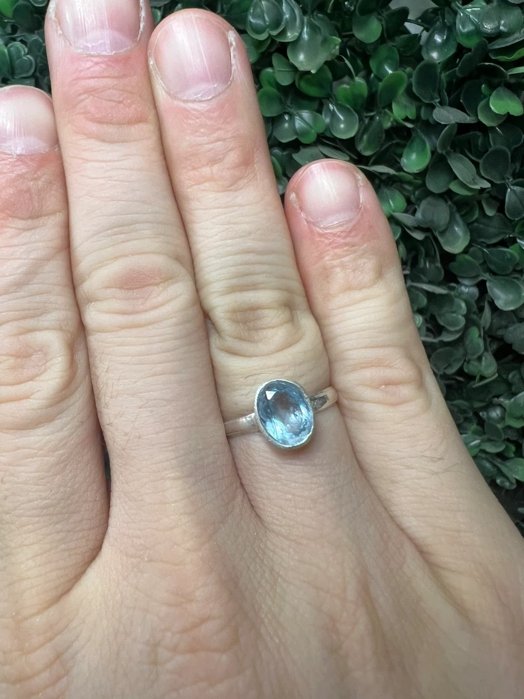This ring features a stunning oval-cut blue topaz set in a silver band. It's a simple yet elegant piece. The band is made of sterling silver. It's perfect for adding a touch of colour to your everyday look!