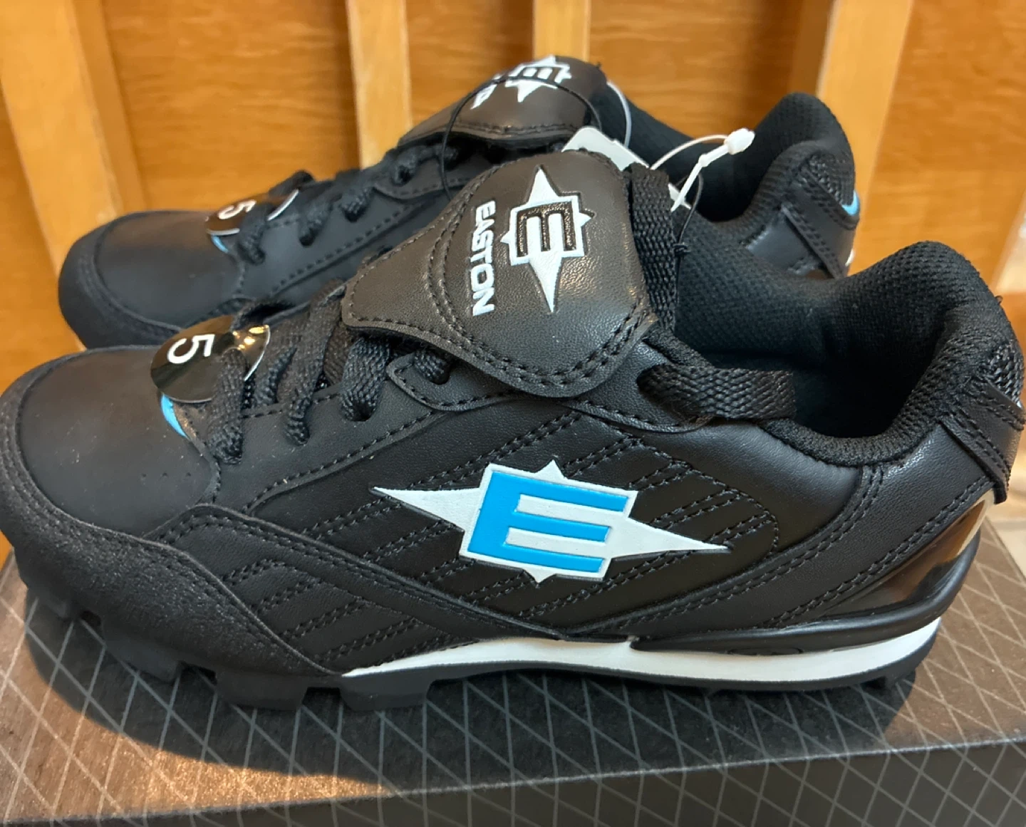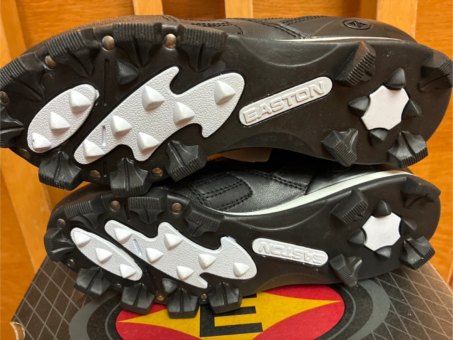 These are brand new Easton black baseball cleats for women in size 5. They feature a durable synthetic leather upper and a rubber cleat sole for excellent traction on the field. These cleats are designed for performance and comfort during games and practices.