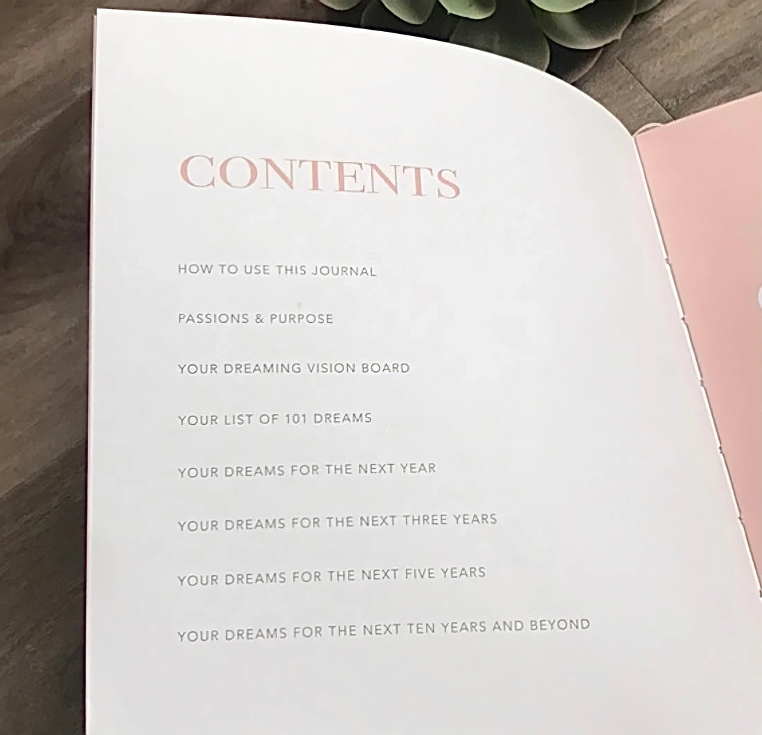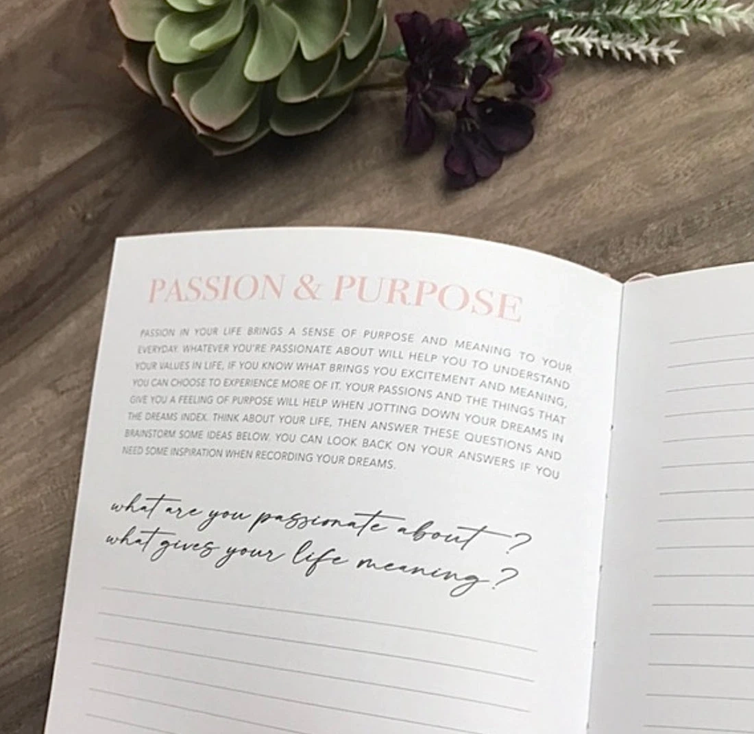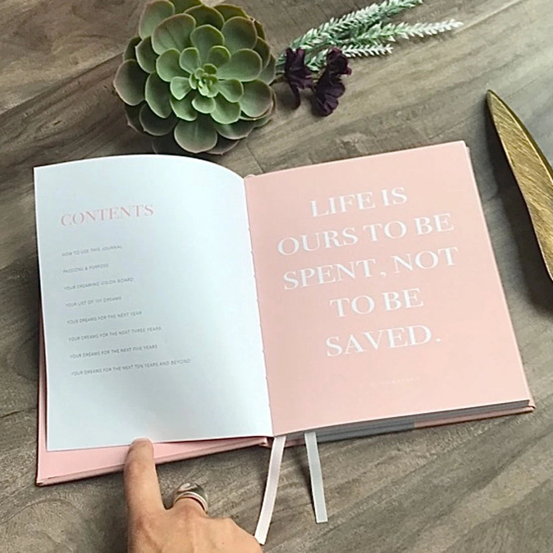 This Dreams Journal is designed to help you explore your passions and purpose. It includes sections for your dreaming vision board and lists of dreams for the next year, three years, five years, and beyond. Pink hardcover with ribbon bookmarks.