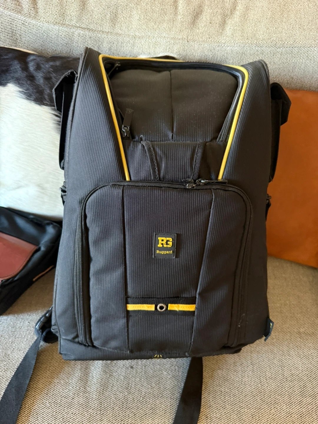 This is a Ruggard camera backpack in black with yellow accents. It's made of durable material. Multiple zippered compartments provide ample storage. It's designed for carrying camera gear.