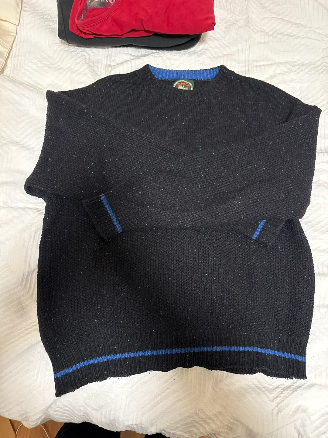 Black speckled knit sweater from Leeza. Features blue stripes on the crew neck, cuffs, and hem. It's a comfortable and stylish piece for cooler weather. Made of soft knit material.