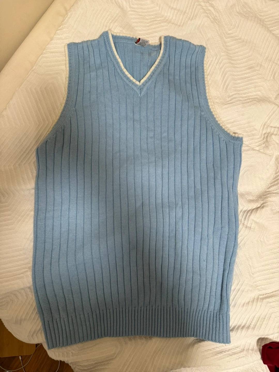 This is a blue V-neck sweater vest from Tommy Hilfiger. It features a ribbed knit texture and a contrast white trim. This vest is perfect for layering over shirts for a preppy look!