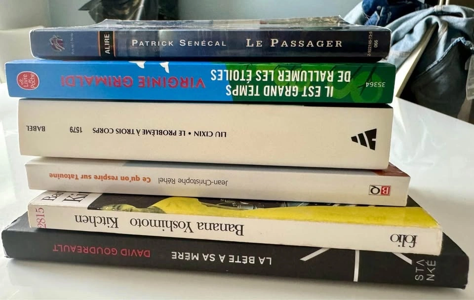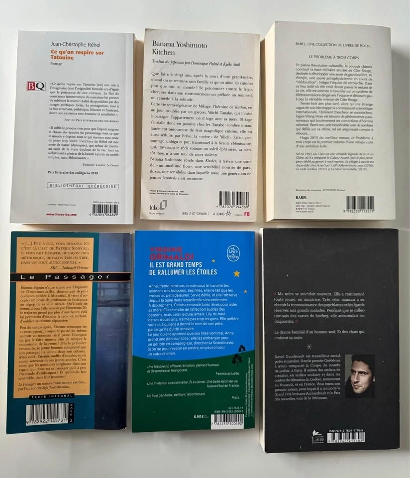 Selling the following French novels: La bête à sa mère by David Goudreault ($20), Kitchen by Banana Yoshimoto ($8), Ce qu’on respire sur tatouine by Jean Christophe Rehel ($10), Le problème à trois corps by Liu Cixin ($20), Il est temps de rallumer les étoiles by Virginie Grimaldi ($15), and Le passager by Patrick Sénécal ($10). All books are in excellent, like-new condition with no scratches and no writing inside. Well-maintained. Highly recommend the novels by David Goudreault and Jean Christophe Rehel!