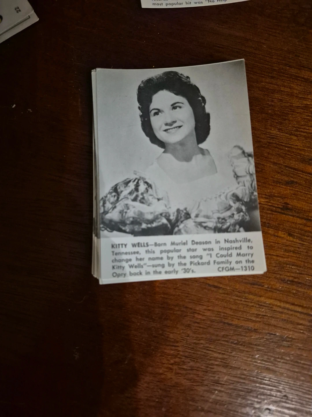 This is a photo card featuring Kitty Wells, born Muriel Deason. It mentions her inspiration for her stage name came from the song "I Could Marry Kitty Wells" by the Pickard Family on the Opry in the early '30s. The catalogue number CFGM-1310 is visible.