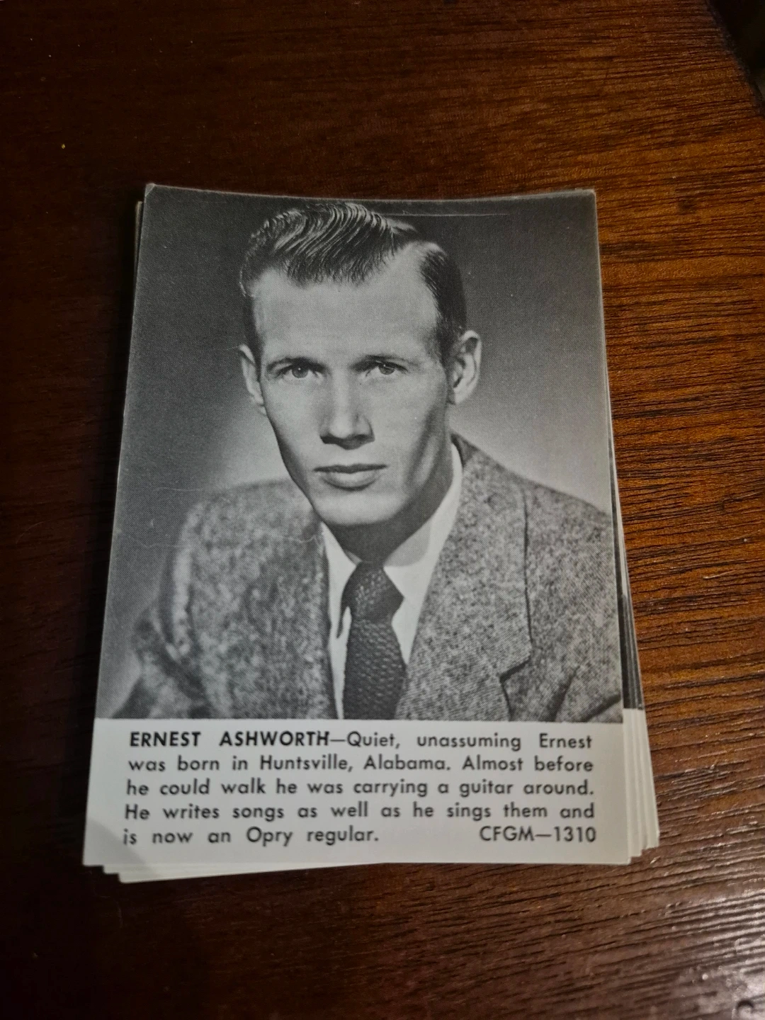 This is a portrait card of Ernest Ashworth. It states he was born in Huntsville, Alabama and was carrying a guitar around almost before he could walk. He writes and sings songs and is an Opry regular. The card has a catalog number of CFGM-1310.