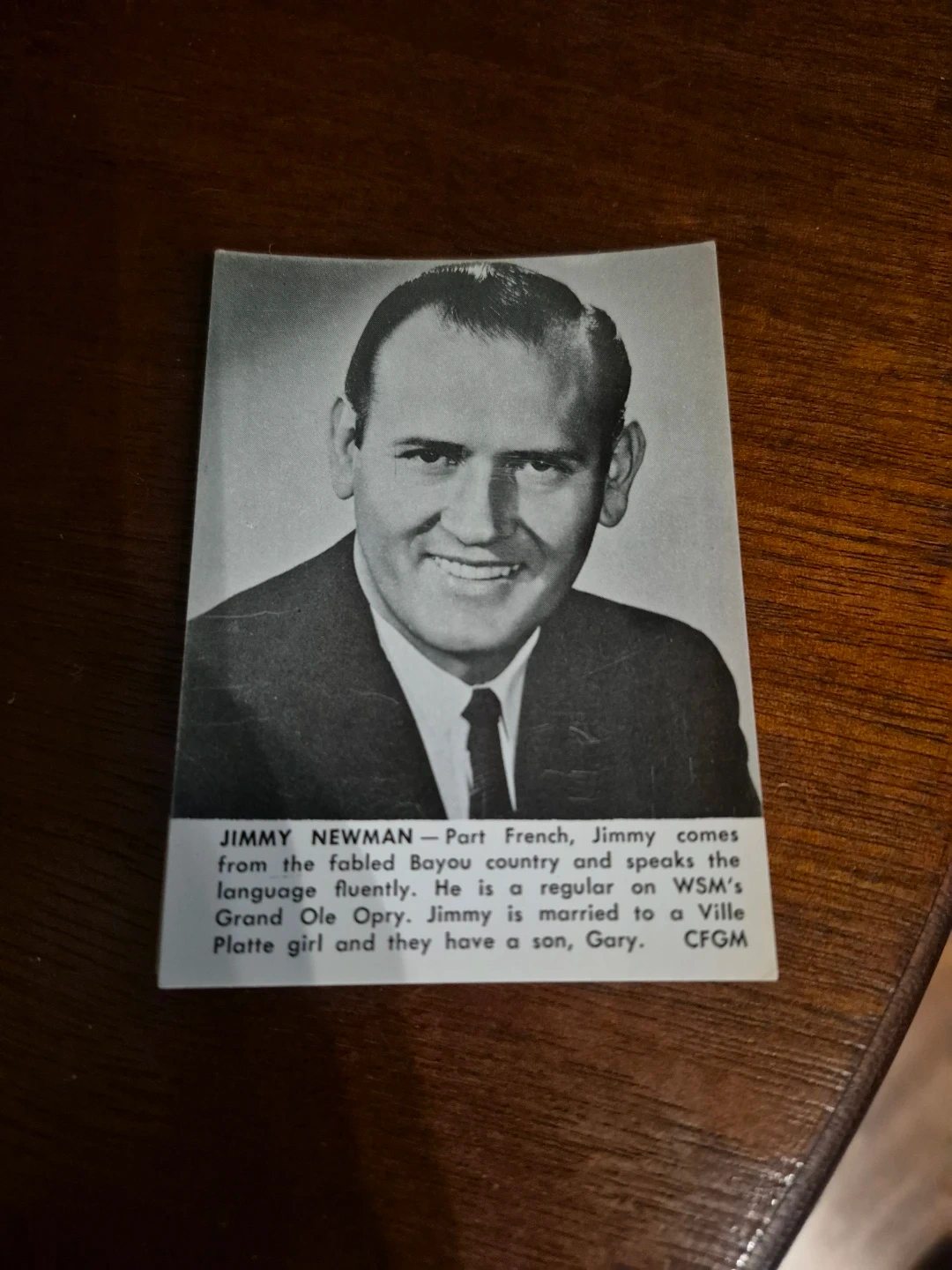 This is a vintage photo of Jimmy Newman. He's described as part French and speaks the language fluently. He's a regular on WSM's Grand Ole Opry. He's married and has a son.