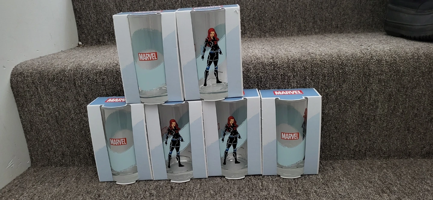 This set includes 6 Marvel glasses featuring Black Widow. They're made of clear glass with a character design. These glasses are perfect for any Marvel fan!