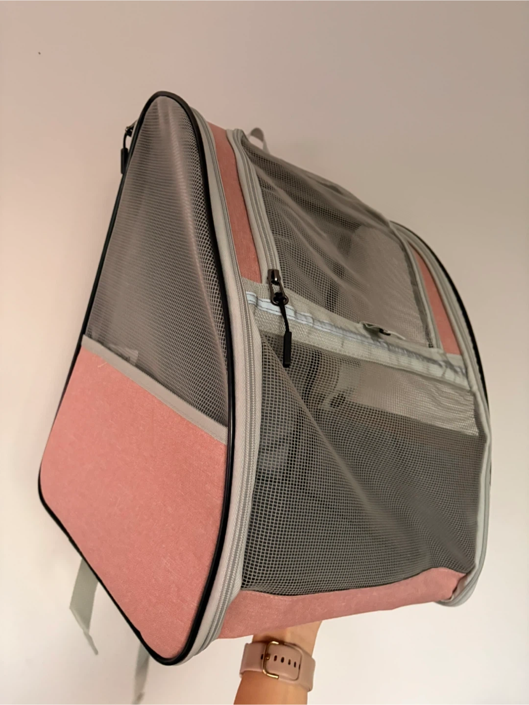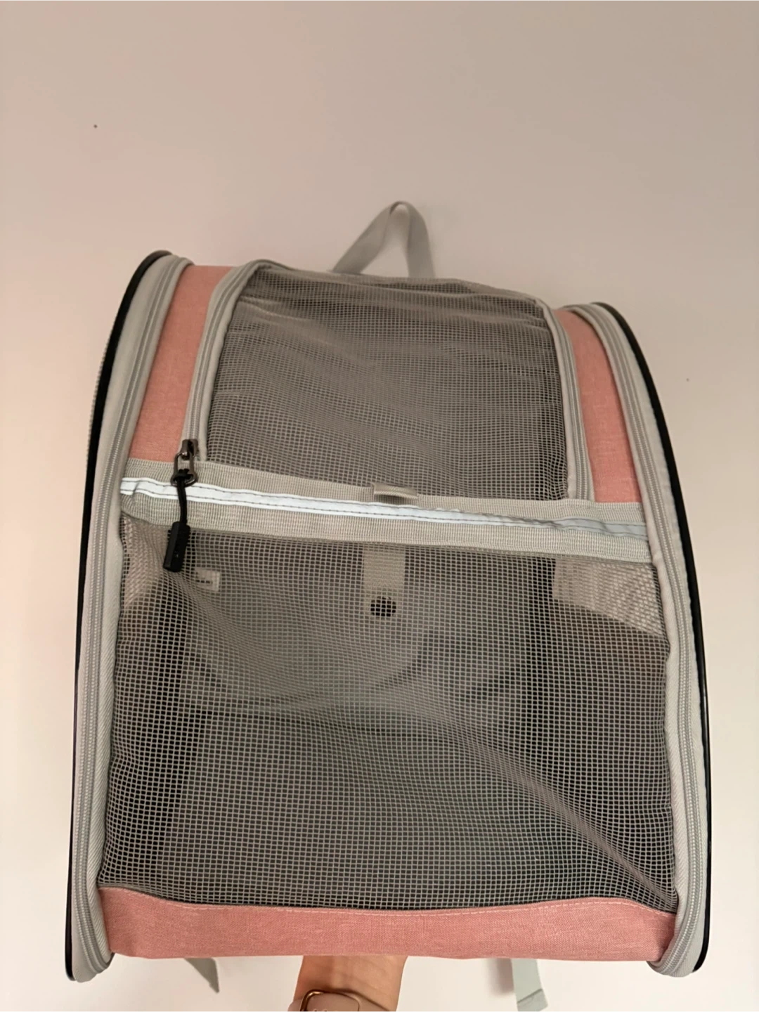 This is a pink and grey pet carrier backpack. It has mesh windows for ventilation. Zippers allow for easy access. It's great for transporting small pets comfortably and safely.