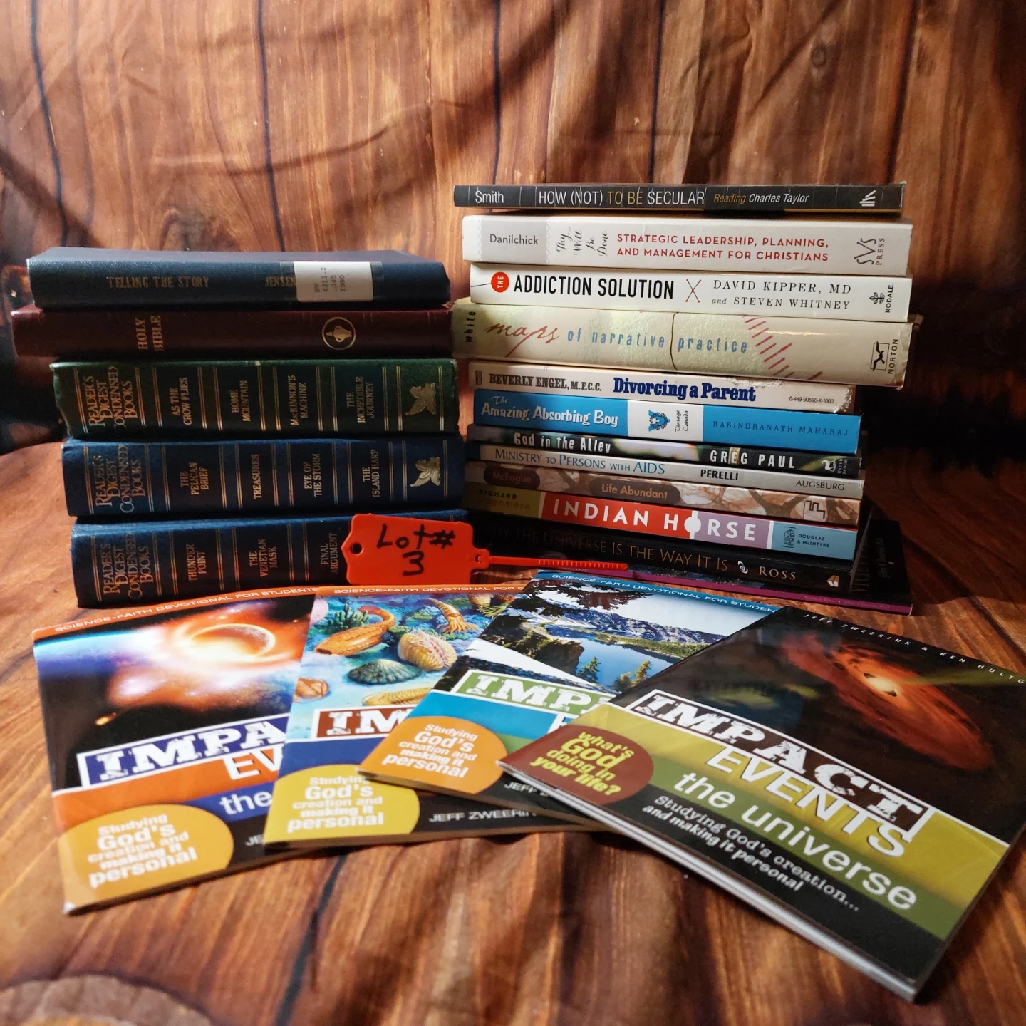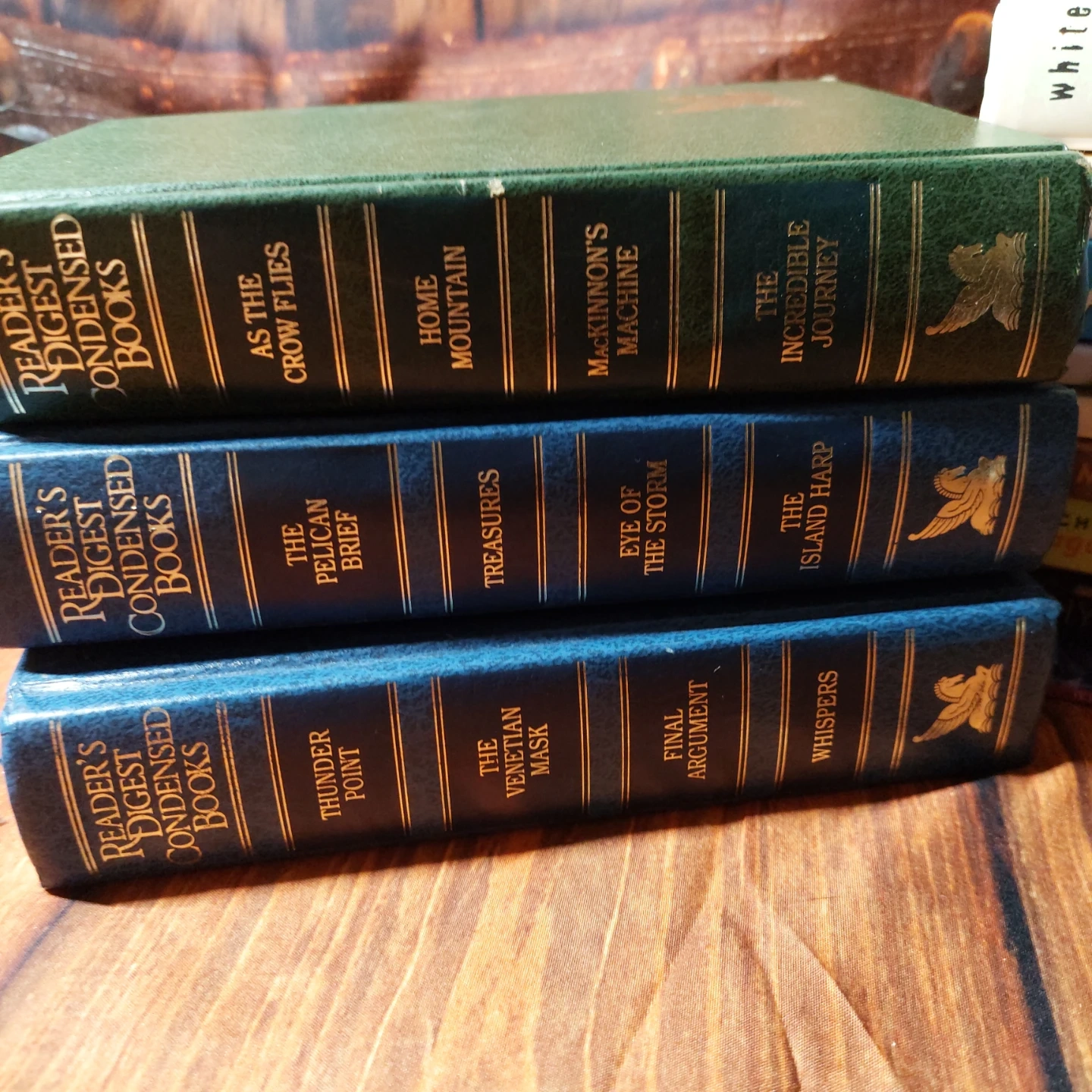 Three volumes of Reader's Digest Condensed Books are included. Titles like 'As the Crow Flies', 'Home Mountain', 'The Pelican Brief', 'Treasures', 'Eye of the Storm', 'Thunder Point', 'The Venetian Mask', 'Final Argument', and 'Whispers' are among those featured. These books offer a variety of stories and authors.